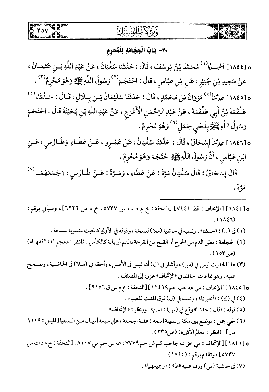 1844- أَخبَرَنا مُحَمَّدُ بْنُ يُوسُفَ, قَالَ: حَدَّثَنَا (1) سُفْيَانَ, عَنْ عَبْدِ اللهِ بْنِ عُثْمَانَ, عَنْ سَعِيدِ بْنِ جُبَيْرٍ, عَنِ ابْنِ عَبَّاسٍ, قَالَ: احْتَجَمَ رَسُولُ اللهِ صَلى الله عَليهِ وسَلم وَهُوَ مُحْرِمٌ (2).