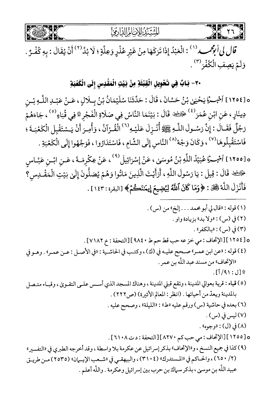 1254- أَخبَرَنا يَحْيَى بْنُ حَسَّانَ, قَالَ: حَدَّثَنَا سُلَيْمَانُ بْنُ بِلاَلٍ, عَنْ عَبْدِ اللهِ بْنِ دِينَارٍ, عَنِ ابْنِ عُمَرَ رَضِيَ اللهُ عَنْهُمَا, قَالَ: بَيْنَمَا النَّاسُ فِي صَلاَةِ الْفَجْرِ فِي قُبَاءٍ, جَاءَهُمْ (1) رَجُلٌ, فَقَالَ: إِنَّ رَسُولَ اللهِ صَلى الله عَليهِ وسَلم أُنْزِلَ عَلَيْهِ الْقُرْآنُ, وَأُمِرَ أَنْ يَسْتَقْبِلَ الْكَعْبَةَ, فَاسْتَقْبِلُوهَا, وَكَانَ وَجْهُ (2) النَّاسِ إِلَى الشَّامِ, فَاسْتَدَارُوا فَوَجَّهُوا إِلَى الْكَعْبَةِ.