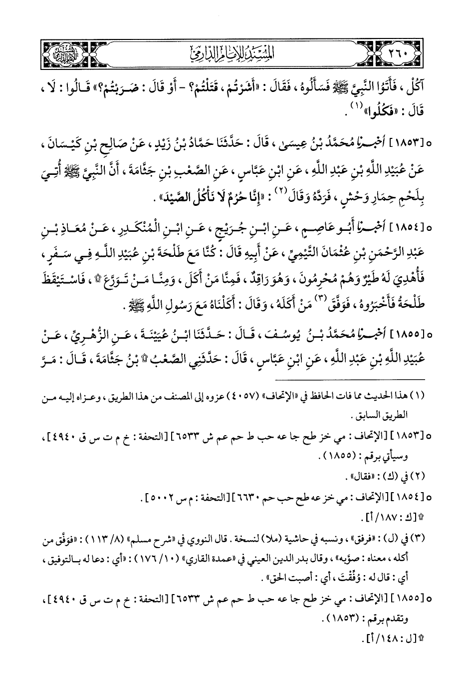 1854- أَخبَرَنا أَبُو عَاصِمٍ, عَنِ ابْنِ جُرَيْجٍ, عَنِ ابْنِ الْمُنْكَدِرِ, عَنْ مُعَاذِ بْنِ عَبْدِ الرَّحْمَنِ بْنِ عُثْمَانَ التَّيْمِيِّ, عَنْ أَبِيهِ, قَالَ: كُنَّا مَعَ طَلْحَةَ بْنِ عُبَيْدِ اللهِ فِي سَفَرٍ, فَأُهْدِيَ لَهُ طَيْرٌ وَهُمْ مُحْرِمُونَ, وَهُوَ رَاقِدٌ, فَمِنَّا مَنْ أَكَلَ وَمِنَّا مَنْ تَوَرَّعَ فَاسْتَيْقَظَ طَلْحَةُ فَأَخْبَرُوهُ, فَوَفَّقَ (1) مَنْ أَكَلَهُ وَقَالَ: أَكَلْنَاه مَعَ رَسُولِ اللهِ صَلى الله عَليهِ وسَلم.
