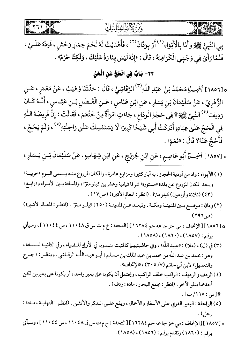 1856- أَخبَرَنا مُحَمَّدُ بْنُ عَبْدِ اللهِ الرَّقَاشِيُّ, قَالَ: حَدَّثَنَا وُهَيْبٌ, عَنْ مَعْمَرٍ, عَنِ الزُّهْرِيِّ, عَنْ سُلَيْمَانَ بْنِ يَسَارٍ, عَنِ ابْنِ عَبَّاسٍ, عَنِ الْفَضْلِ بْنِ عَبَّاسٍ؛ أَنَّهُ كَانَ رَدِيفَ النَّبِيِّ صَلى الله عَليهِ وسَلم فِي حَجَّةِ الْوَدَاعِ, جَاءَتِ امْرَأَةٌ مِنْ خَثْعَمَ, فَقَالَتْ: إِنَّ فَرِيضَةَ اللهِ فِي الْحَجِّ عَلَى عِبَادِهِ أَدْرَكَتْ أَبِي شَيْخًا كَبِيرًا, لاَ يَسْتَمْسِكُ عَلَى رَاحِلَتِهِ وَلَمْ يَحُجَّ, فَأَحُجُّ (1) عَنْهُ؟ قَالَ: نَعَمْ (2).