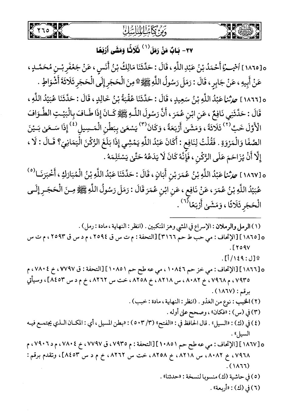 1865- أَخبَرَنا أَحْمَدُ بْنُ عَبْدِ اللهِ, قَالَ: حَدَّثَنَا مَالِكُ بْنُ أَنَسٍ, عَنْ جَعْفَرِ بْنِ مُحَمَّدٍ, عَنْ أَبِيهِ, عَنْ جَابِرٍ, قَالَ: رَمَلَ رَسُولُ اللهِ صَلى الله عَليهِ وسَلم مِنَ الْحَجَرِ إِلَى الْحَجَرِ ثَلاَثَةَ أَشْوَاطٍ.