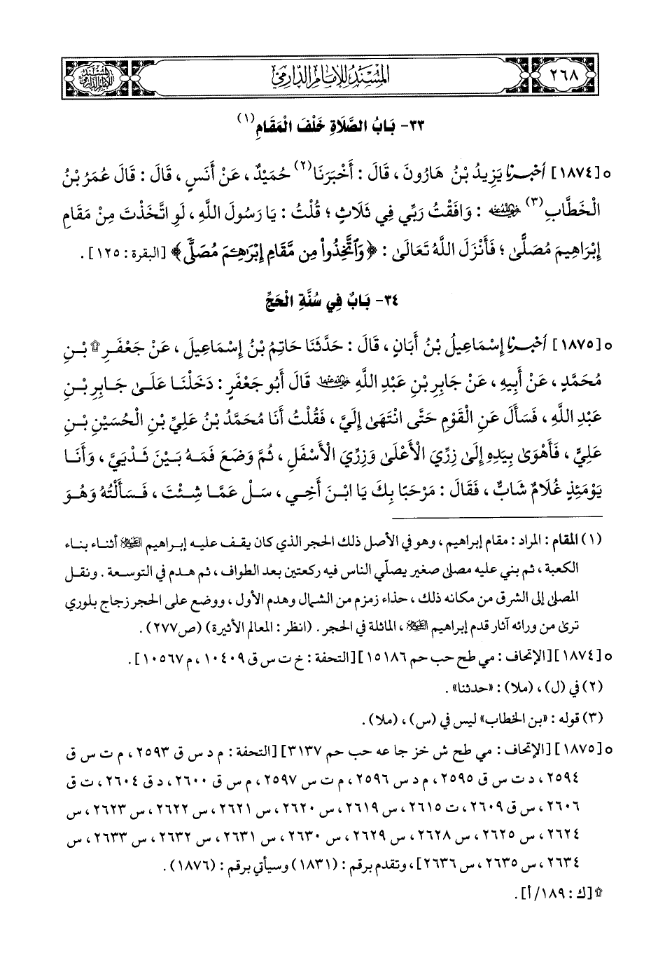 1874- أَخبَرَنا يَزِيدُ بْنُ هَارُونَ, قَالَ: أَخبَرَنا حُمَيْدٌ, عَنْ أَنَسٍ, قَالَ: قَالَ عُمَرُ بْنُ الْخَطَّابِ رَضِيَ اللهُ عَنْهُ: وَافَقْتُ رَبِّي فِي ثَلاَثٍ, قُلْتُ: يَا رَسُولَ اللهِ, لَوِ اتَّخَذْتَ مِنْ مَقَامِ إِبْرَاهِيمَ مُصَلًّى, فَأَنْزَلَ اللهُ تَعَالى: {وَاتَّخِذُوا مِنْ مَقَامِ إِبْرَاهِيمَ مُصَلًّى} (1).