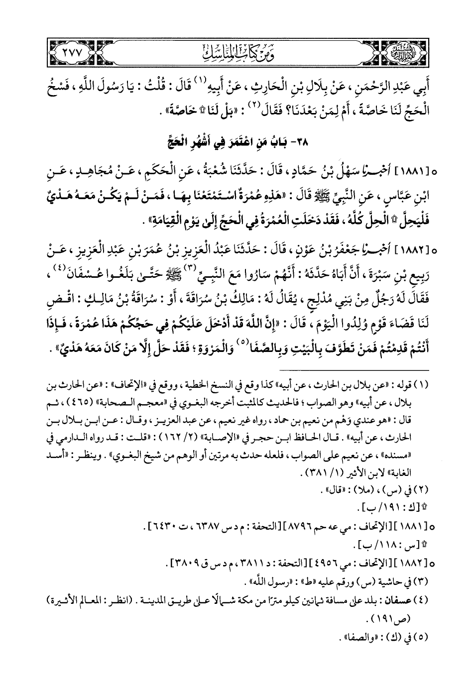 1882- أَخبَرَنا جَعْفَرُ بْنُ عَوْنٍ, قَالَ: حَدَّثَنَا عَبْدُ الْعَزِيزِ بْنُ عُمَرَ بْنِ عَبْدِ الْعَزِيزِ, عَنْ رَبِيعِ بْنِ سَبْرَةَ, أَنَّ أَبَاهُ حَدَّثَهُ؛ أَنَّهُمْ سَارُوا مَعَ النَّبِيِّ صَلى الله عَليهِ وسَلم حَتَّى بَلَغُوا عُسْفَانَ, فَقَالَ لَهُ رَجُلٌ مِنْ بَنِي مُدْلِجٍ, يُقَالُ لَهُ: مَالِكُ بْنُ سُرَاقَةَ, أَوْ سُرَاقَةُ بْنُ مَالِكٍ: اقْضِ لَنَا قَضَاءَ قَوْمٍ وُلِدُوا الْيَوْمَ, قَالَ: إِنَّ اللهَ قَدْ أَدْخَلَ عَلَيْكُمْ فِي حَجِّكُمْ هَذَا عُمْرَةً, فَإِذَا أَنْتُمْ قَدِمْتُمْ فَمَنْ تَطَوَّفَ بِالْبَيْتِ وَبِالصَّفَا وَالْمَرْوَةِ, فَقَدْ حَلَّ, إِلاَّ مَنْ كَانَ مَعَهُ هَدْيٌ.