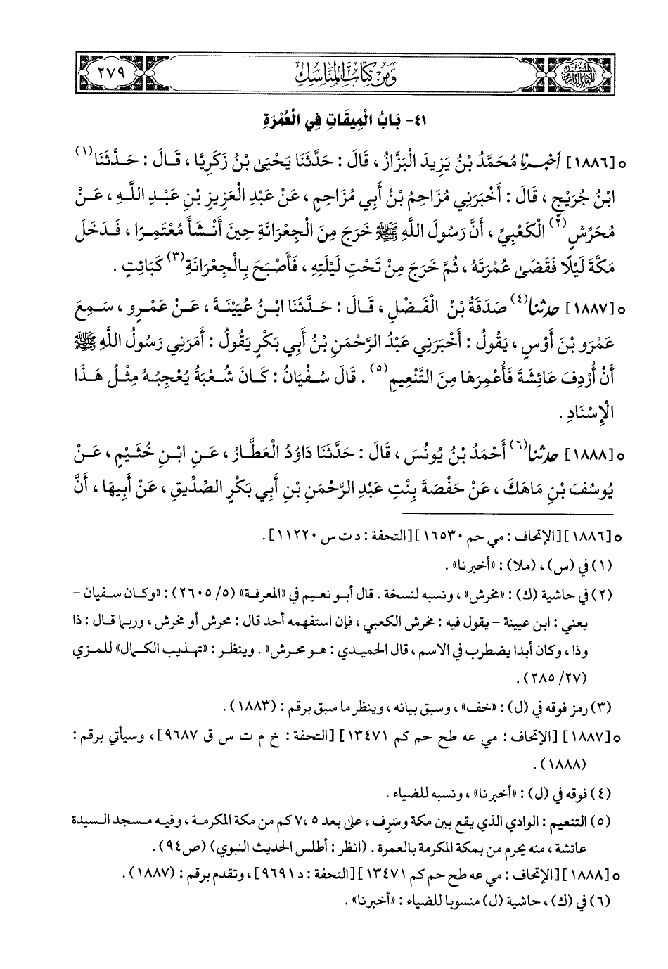 1887- حَدَّثَنَا صَدَقَةُ بْنُ الْفَضْلِ, قَالَ: حَدَّثَنَا ابْنُ عُيَيْنَةَ, عَنْ عَمْرٍو, سَمِعَ عَمْرَو بْنَ أَوْسٍ يَقُولُ: أَخبَرَنِي عَبْدُ الرَّحْمَنِ بْنُ أَبِي بَكْرٍ يَقُولُ: أَمَرَنِي رَسُولُ اللهِ صَلى الله عَليهِ وسَلم أَنْ أُرْدِفَ عَائِشَةَ, فَأُعْمِرَهَا مِنَ التَّنْعِيمِ.