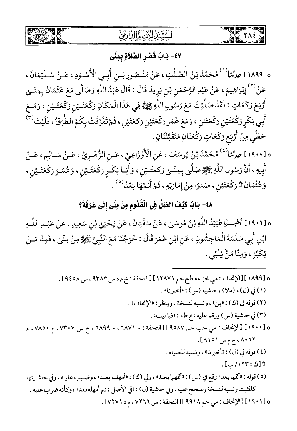 1899- حَدَّثَنَا مُحَمَّدُ بْنُ الصَّلْتِ, عَنْ مَنْصُورِ بْنِ أَبِي الأَسْوَدِ, عَنْ سُلَيْمَانَ, عَنْ إِبْرَاهِيمَ, عَنْ عَبْدِ الرَّحْمَنِ بْنِ يَزِيدَ, قَالَ: قَالَ عَبْدُ اللهِ, وَصَلَّى مَعَ عُثْمَانَ بِمِنًى أَرْبَعَ رَكَعَاتٍ: لَقَدْ صَلَّيْتُ مَعَ رَسُولِ اللهِ صَلى الله عَليهِ وسَلم فِي هَذَا الْمَكَانِ رَكْعَتَيْنِ رَكْعَتَيْنِ, وَمَعَ أَبِي بَكْرٍ رَكْعَتَيْنِ رَكْعَتَيْنِ, وَمَعَ عُمَرَ رَكْعَتَيْنِ رَكْعَتَيْنِ, ثُمَّ تَفَرَّقَتْ بِكُمُ الطُّرُقُ, فَلَيْتَ حَظِّي مِنْ أَرْبَعِ رَكَعَاتٍ رَكْعَتَانِ مُتَقَبَّلَتَانِ.