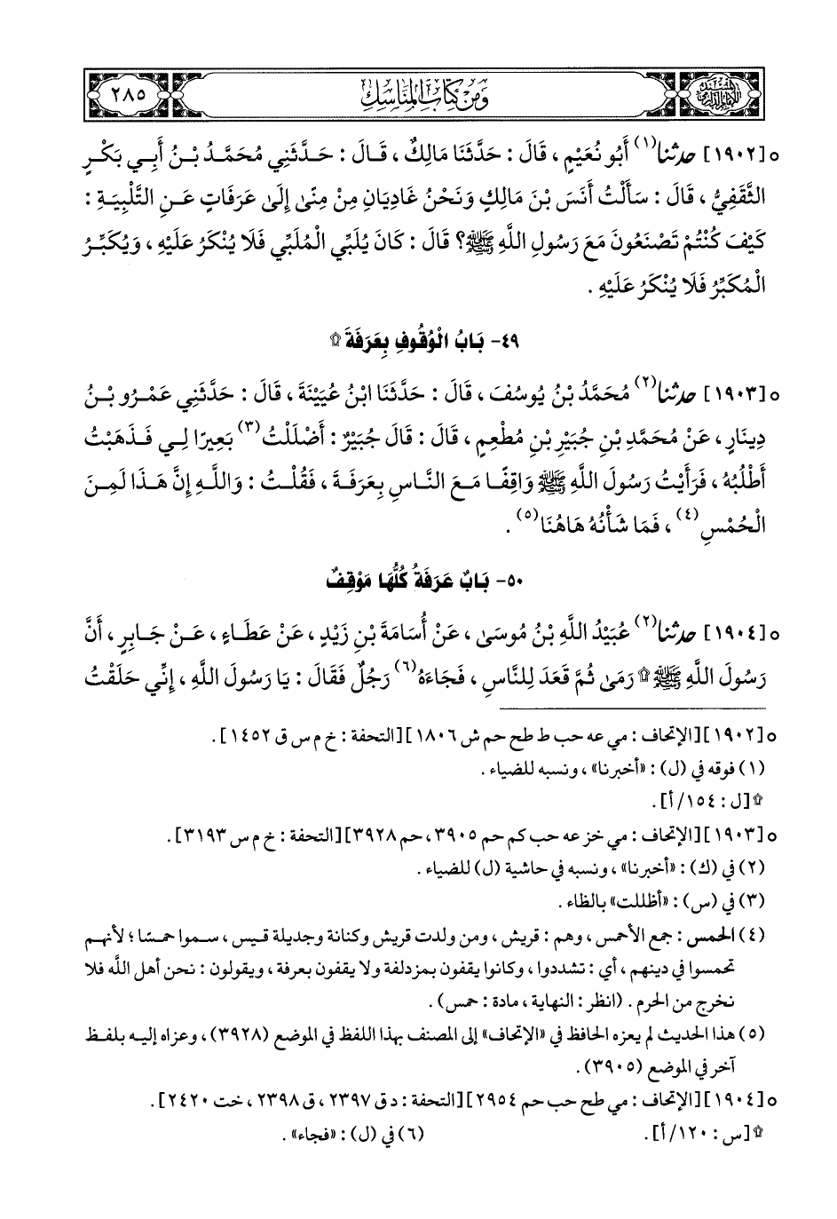 1903- حَدَّثَنَا مُحَمَّدُ بْنُ يُوسُفَ, قَالَ: حَدَّثَنَا ابْنُ عُيَيْنَةَ, قَالَ: حَدَّثَنِي عَمْرُو بْنُ دِينَارٍ, عَنْ مُحَمَّدِ بْنِ جُبَيْرِ بْنِ مُطْعِمٍ, قَالَ: قَالَ جُبَيْرٌ: أَضْلَلْتُ بَعِيرًا لِي, فَذَهَبْتُ أَطْلُبُهُ, فَرَأَيْتُ رَسُولَ اللهِ صَلى الله عَليهِ وسَلم وَاقِفًا مَعَ النَّاسِ بِعَرَفَةَ, فَقُلْتُ: وَاللهِ إِنَّ هَذَا لَمِنَ الْحُمْسِ, فَمَا شَأْنُهُ هَاهُنَا.