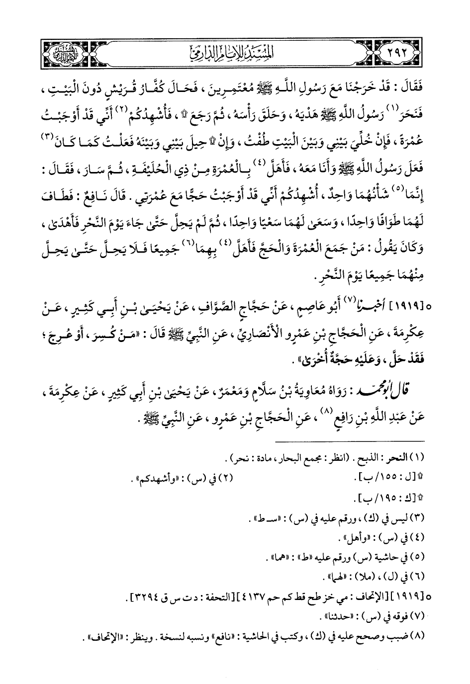 1919- أَخبَرَنا أَبُو عَاصِمٍ, عَنْ حَجَّاجٍ الصَّوَّافِ, عَنْ يَحْيَى بْنِ أَبِي كَثِيرٍ, عَنْ عِكْرِمَةَ, عَنِ الْحَجَّاجِ بْنِ عَمْرٍو الأنْصَارِيِّ, عَنِ النَّبِيِّ صَلى الله عَليهِ وسَلم, قَالَ: مَنْ كُسِرَ, أَوْ عُرِجَ فَقَدْ حَلَّ وَعَلَيْهِ حَجَّةٌ أُخْرَى.