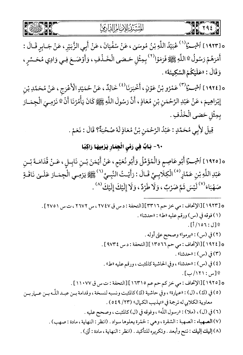 1925- أَخبَرَنا أَبُو عَاصِمٍ, وَالْمُؤَمَّلُ, وَأَبُو نُعَيْمٍ, عَنْ أَيْمَنَ بْنِ نَابِلٍ, عَنْ قُدَامَةَ بْنِ عَبْدِ اللهِ بْنِ عَمَّارٍ الْكِلاَبِيِّ, قَالَ: رَأَيْتُ النَّبِيَّ صَلى الله عَليهِ وسَلم يَرْمِي الْجِمَارَ عَلَى نَاقَةٍ صَهْبَاءَ, لَيْسَ ثَمَّ ضَرْبٌ, وَلاَ طَرْدٌ, وَلاَ إِلَيْكَ إِلَيْكَ.
