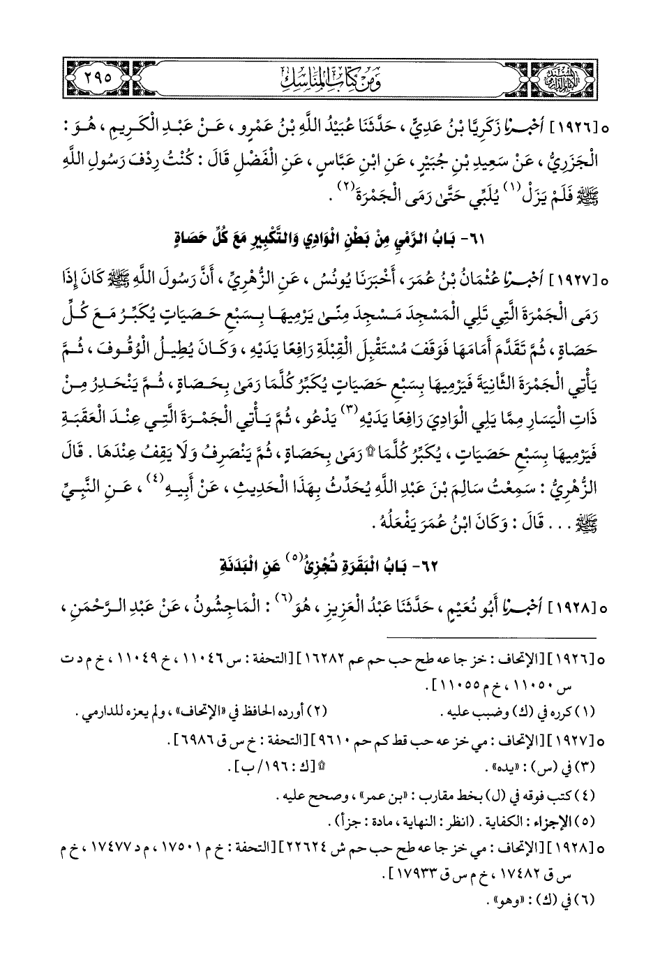 1926- أَخبَرَنا زَكَرِيَّا بْنُ عَدِيٍّ, حَدَّثَنَا عُبَيْدُ اللهِ بْنُ عَمْرٍو, عَنْ عَبْدِ الْكَرِيمِ, هُوَ الْجَزَرِيُّ, عَنْ سَعِيدِ بْنِ جُبَيْرٍ, عَنِ ابْنِ عَبَّاسٍ, عَنِ الْفَضْلِ, قَالَ: كُنْتُ رِدْفَ رَسُولِ اللهِ صَلى الله عَليهِ وسَلم, فَلَمْ يَزَلْ يُلَبِّي, حَتَّى رَمَى الْجَمْرَةَ (1).