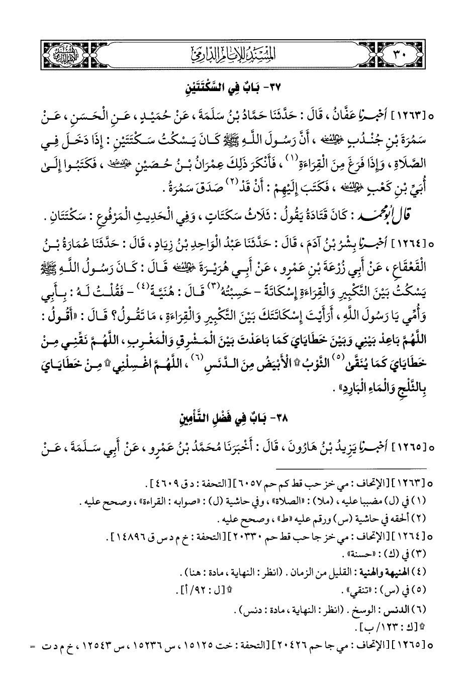1263- أَخبَرَنا عَفَّانُ, قَالَ: حَدَّثَنَا حَمَّادُ بْنُ سَلَمَةَ, عَنْ حُمَيْدٍ, عَنِ الْحَسَنِ, عَنْ سَمُرَةَ بْنِ جُنْدُبٍ رَضِيَ اللهُ عَنْهُ, أَنَّ رَسُولَ اللهِ صَلى الله عَليهِ وسَلم كَانَ يَسْكُتُ سَكْتَتَيْنِ إِذَا دَخَلَ فِي الصَّلاَةِ, وَإِذَا فَرَغَ مِنَ الْقِرَاءَةِ, فَأَنْكَرَ ذَلِكَ عِمْرَانُ بْنُ حُصَيْنٍ رَضِيَ اللهُ عَنْهُمَا, فَكَتَبُوا إِلَى أُبَيِّ بْنِ كَعْبٍ رَضِيَ اللهُ عَنْهُ فَكَتَبَ إِلَيْهِمْ أَنْ قَدْ صَدَقَ سَمُرَةُ.