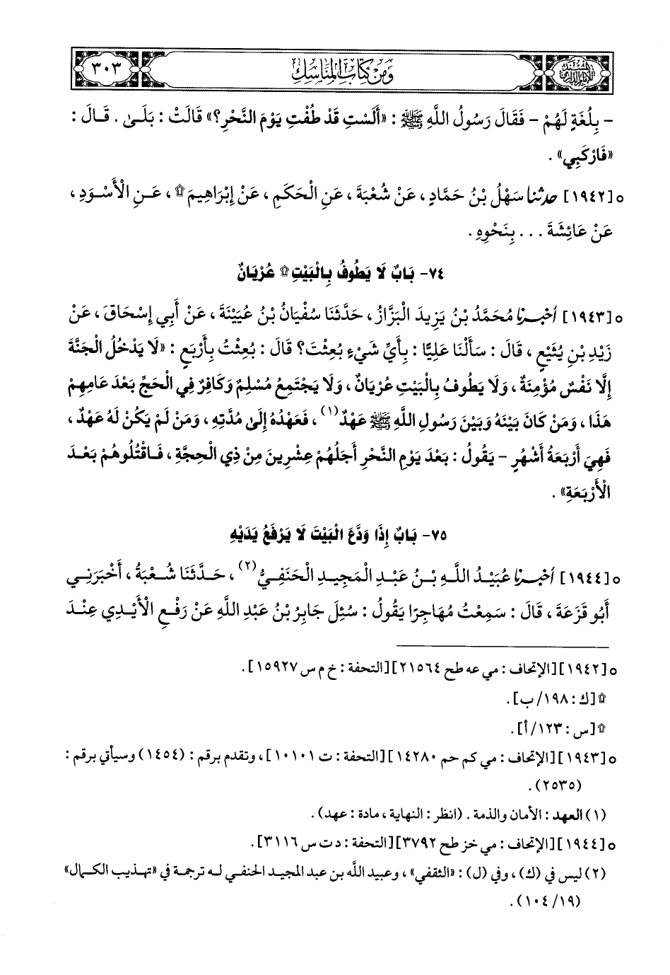 74- باب لاَ يَطُوفُ بِالْبَيْتِ عُرْيَانٌ.