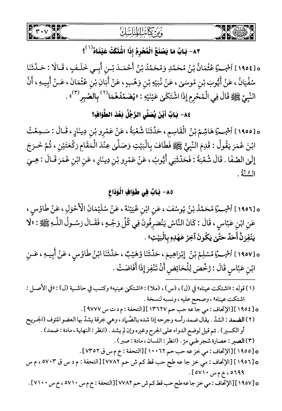 1954- أَخبَرَنا عُثْمَانُ بْنُ مُحَمَّدِ (2), وَمُحَمَّدُ بْنُ أَحْمَدَ بْنِ أَبِي خَلَفٍ, قَالاَ: حَدَّثَنَا سُفْيَانُ, عَنْ أَيُّوبَ بْنِ مُوسَى, عَنْ نُبَيْهِ بْنِ وَهْبٍ, عَنْ أَبَانَ بْنِ عُثْمَانَ, عَنْ أَبِيهِ؛ أَنَّ النَّبِيَّ صَلى الله عَليهِ وسَلم قَالَ فِي الْمُحْرِمِ: إِذَا اشْتَكَى عَيْنَيْهِ يُضَمِّدُهُمَا (3) بِالصَّبِرِ.