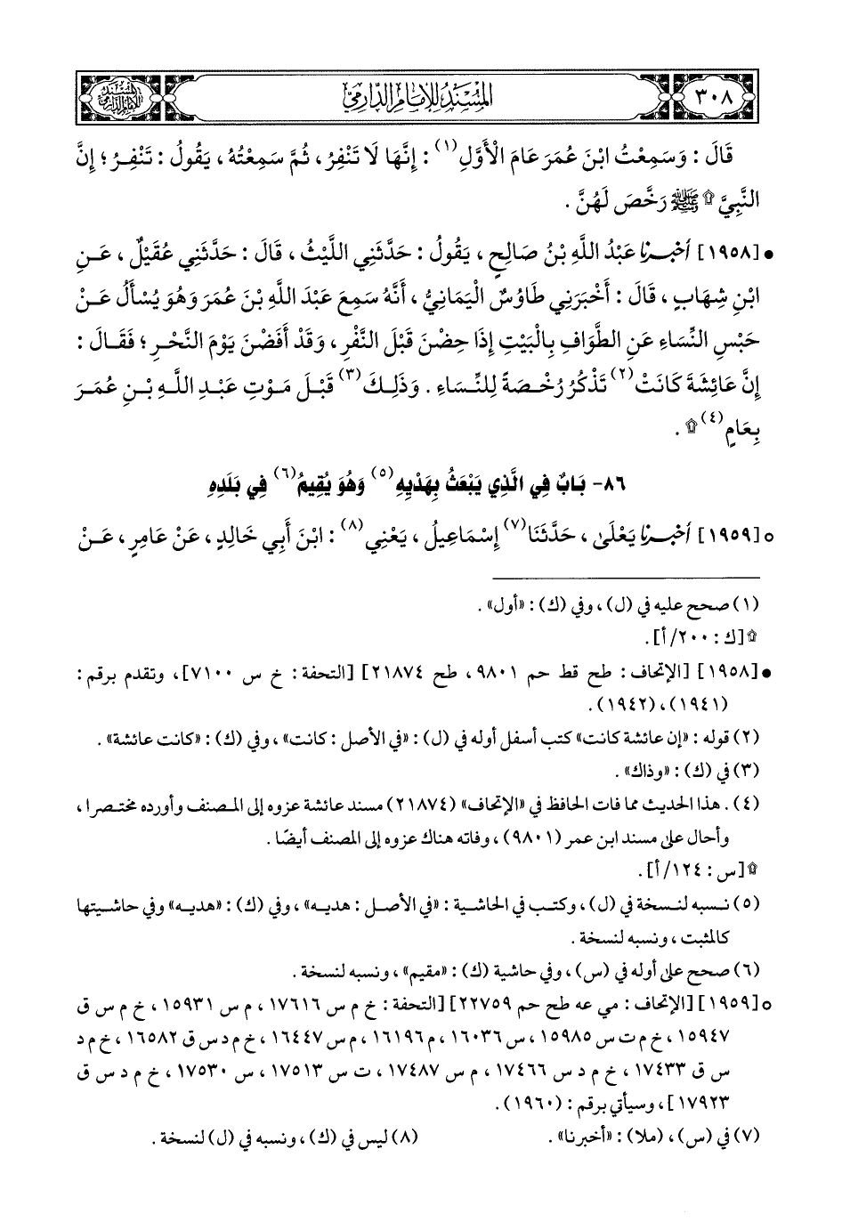1958- أَخبَرَنا عَبْدُ اللهِ بْنُ صَالِحٍ, يَقُولُ (1): حَدَّثَنِي اللَّيْثُ, قَالَ: حَدَّثَنِي عُقَيْلٌ, عَنِ ابْنِ شِهَابٍ, قَالَ: أَخبَرَنِي طَاوُوسٌ الْيَمَانِيُّ, أَنَّهُ سَمِعَ عَبْدَ اللهِ بْنَ عُمَرَ وَهُوَ يُسْأَلُ عَنْ حَبْسِ النِّسَاءِ عَنِ الطَّوَافِ بِالْبَيْتِ إِذَا حِضْنَ قَبْلَ النَّفْرِ وَقَدْ أَفَضْنَ يَوْمَ النَّحْرِ, فَقَالَ: إِنَّ عَائِشَةَ كَانَتْ (2) تَذْكُرُ رُخْصَةً لِلنِّسَاءِ, وَذَلِكَ قَبْلَ مَوْتِ عَبْدِ اللهِ بْنِ عُمَرَ بِعَامٍ (2).