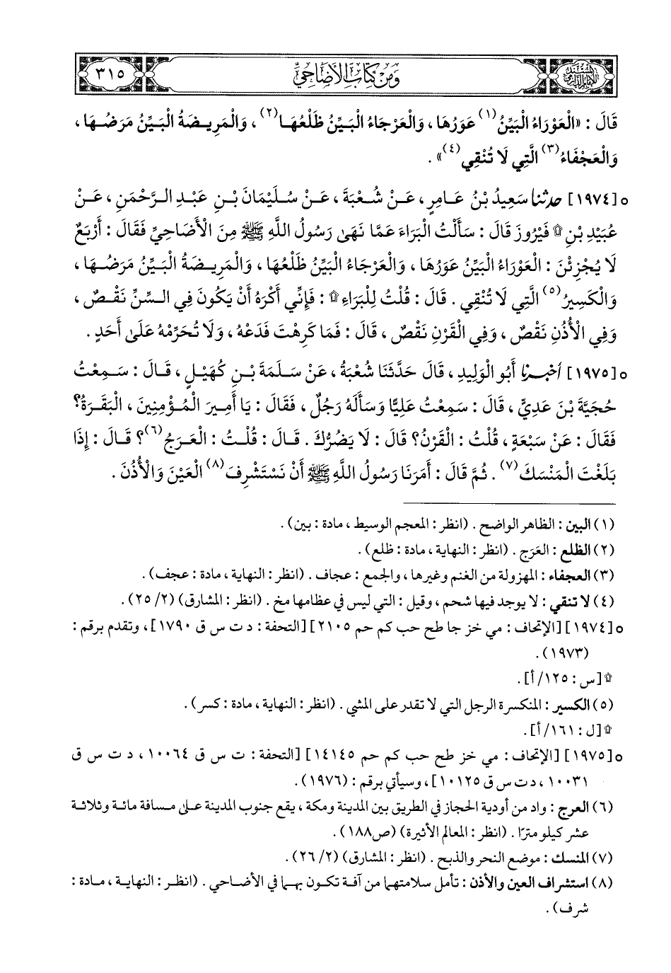 1975- أَخبَرَنا أَبُو الْوَلِيدِ, قَالَ: حَدَّثَنَا شُعْبَةُ, عَنْ سَلَمَةَ بْنِ كُهَيْلٍ, قَالَ: سَمِعْتُ حُجَيَّةَ بْنَ عَدِيٍّ, قَالَ: سَمِعْتُ عَلِيًّا, وَسَأَلَهُ رَجُلٌ, فَقَالَ: يَا أَمِيرَ الْمُؤْمِنِينَ: الْبَقَرَةُ؟ فَقَالَ: عَنْ سَبْعَةٍ, قُلْتُ: الْقَرْنُ؟ قَالَ: لاَ يَضُرُّكَ, قَالَ: قُلْتُ: الْعَرَجُ؟ قَالَ: إِذَا بَلَغْتَ الْمَنْسَكَ, ثُمَّ قَالَ: أَمَرَنَا رَسُولُ اللهِ صَلى الله عَليهِ وسَلم أَنْ نَسْتَشْرِفَ الْعَيْنَ وَالأُذُنَ.