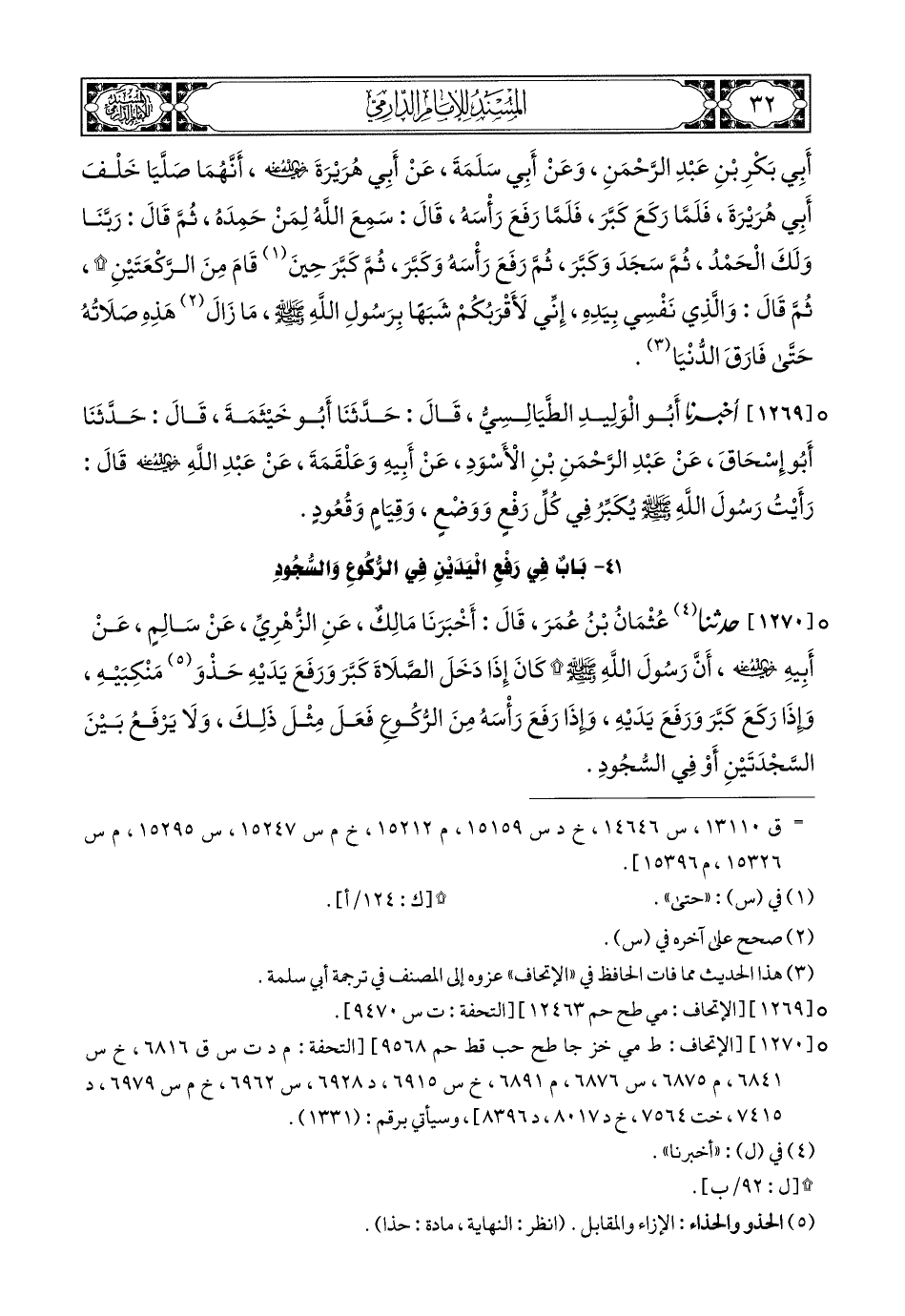 1269- أَخبَرَنا أَبُو الْوَلِيدِ الطَّيَالِسِيُّ, قَالَ: حَدَّثَنَا أَبُو خَيْثَمَةَ, قَالَ: حَدَّثَنَا أَبُو إِسْحَاقَ, عَنْ عَبْدِ الرَّحْمَنِ بْنِ الأَسْوَدِ, عَنْ أَبِيهِ, وَعَلْقَمَةَ (1), عَنْ عَبْدِ اللهِ رَضِيَ اللهُ عَنْهُ, قَالَ: رَأَيْتُ رَسُولَ اللهِ صَلى الله عَليهِ وسَلم يُكَبِّرُ فِي كُلِّ رَفْعٍ وَوَضْعٍ وَقِيَامٍ وَقُعُودٍ.
