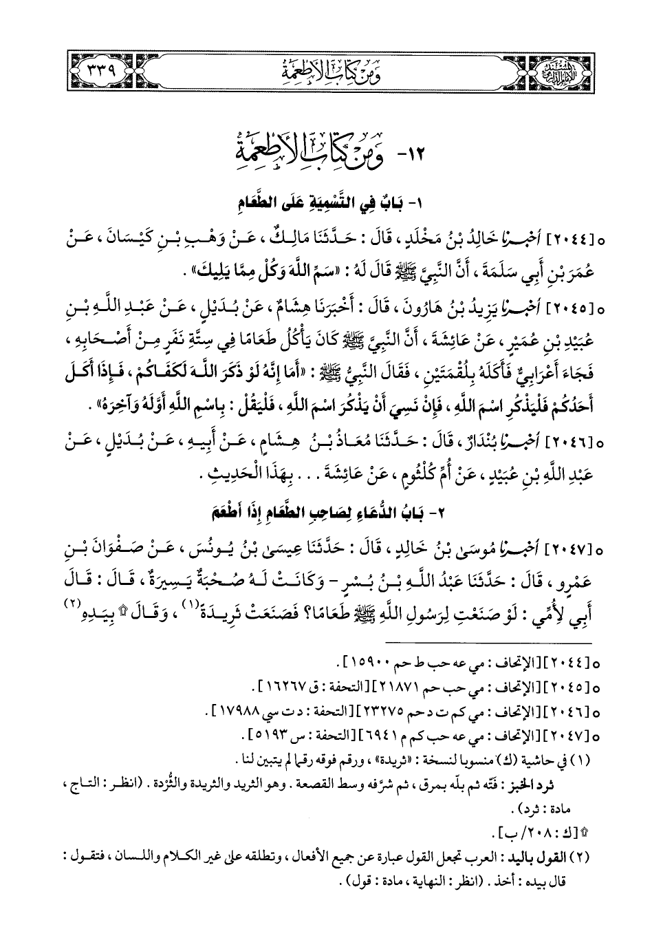2045- أَخبَرَنا يَزِيدُ بْنُ هَارُونَ, قَالَ: أَخبَرَنا هِشَامٌ, عَنْ بُدَيْلٍ, عَنْ عَبْدِ اللهِ بْنِ عُبَيْدِ بْنِ عُمَيْرٍ, عَنْ عَائِشَةَ, أَنَّ النَّبِيَّ صَلى الله عَليهِ وسَلم كَانَ يَأْكُلُ طَعَامًا فِي سِتَّةِ نَفَرٍ مِنْ أَصْحَابِهِ, فَجَاءَ أَعْرَابِيٌّ فَأَكَلَهُ بِلُقْمَتَيْنِ, فَقَالَ النَّبِيُّ صَلى الله عَليهِ وسَلم: أَمَا إِنَّهُ لَوْ ذَكَرَ اسْمَ اللهِ لَكَفَاكُمْ, فَإِذَا أَكَلَ أَحَدُكُمْ فَلْيَذْكُرِ اسْمَ اللهِ, فَإِنْ نَسِيَ أَنْ يَذْكُرَ اسْمَ اللهِ, فَلْيَقُلْ: بِسْمِ اللهِ أَوَّلَهُ وَآخِرَهُ.