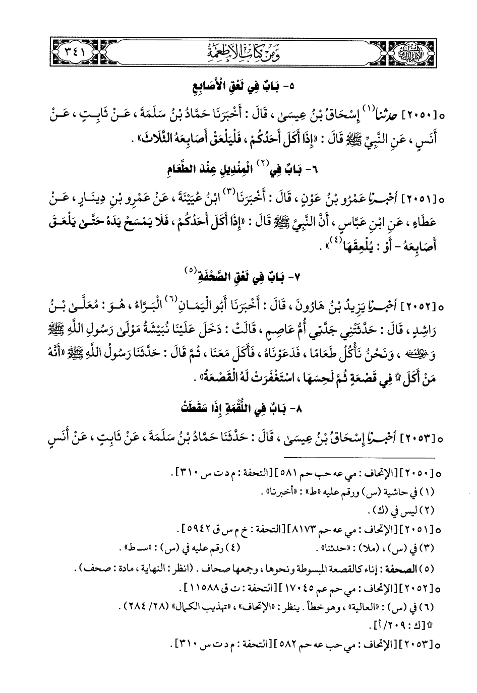 2050 - حَدَّثَنَا إِسْحَاقُ بْنُ عِيسَى, قَالَ: أَخبَرَنا حَمَّادُ بْنُ سَلَمَةَ, عَنْ ثَابِتٍ, عَنْ أَنَسٍ, عَنِ النَّبِيِّ صَلى الله عَليهِ وسَلم, قَالَ: إِذَا أَكَلَ أَحَدُكُمْ, فليَلْعَقَ أَصَابِعَهُ الثَّلاَثَ.