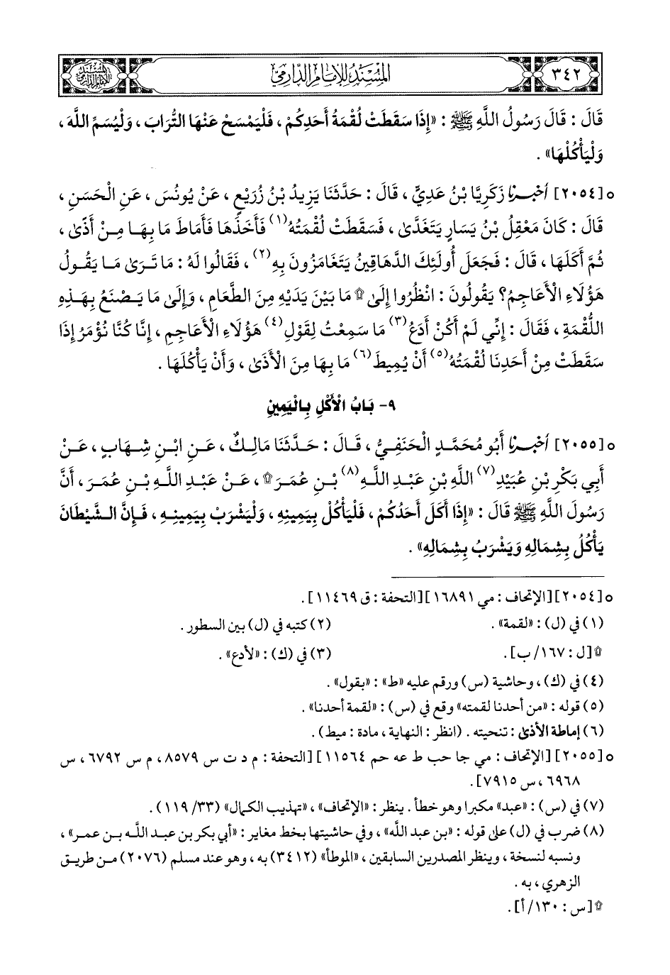 2054- أَخبَرَنا زَكَرِيَّا بْنُ عَدِيٍّ, قَالَ: حَدَّثَنَا يَزِيدُ بْنُ زُرَيْعٍ, عَنْ يُونُسَ, عَنِ الْحَسَنِ, قَالَ: كَانَ مَعْقِلُ بْنُ يَسَارٍ يَتَغَدَّى, فَسَقَطَتْ لُقْمَتُهُ, فَأَخَذَهَا, فَأَمَاطَ مَا بِهَا مِنْ أَذًى, ثُمَّ أَكَلَهَا, قَالَ: فَجَعَلَ أُولَئِكَ الدَّهَاقِينُ يَتَغَامَزُونَ بِهِ, فَقَالُوا لَهُ: مَا تَرَى مَا يَقُولُ هَؤُلاَءِ الأَعَاجِمُ, يَقُولُونَ: انْظُرُوا إِلَى مَا بَيْنَ يَدَيْهِ مِنَ الطَّعَامِ, وَإِلَى مَا يَصْنَعُ بِهَذِهِ اللُّقْمَةِ؟ فَقَالَ: إِنِّي لَمْ أَكُنْ أَدَعُ (1) مَا سَمِعْتُ (2) لِقَوْلِ (3) هَؤُلاَءِ الأَعَاجِمِ, إِنَّا كُنَّا نُؤْمَرُ إِذَا سَقَطَتْ مَنْ أَحَدِنَا لُقْمَتَهُ أَنْ يُمِيطَ مَا بِهَا مِنَ الأَذَى, وَأَنْ يَأْكُلَهَا.