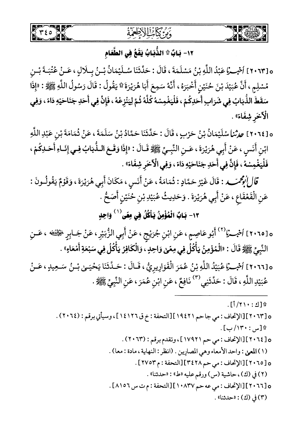 2065- أَخبَرَنا أَبُو عَاصِمٍ, عَنِ ابْنِ جُرَيْجٍ, عَنْ أَبِي الزُّبَيْرِ, عَنْ جَابِرٍ رَضِيَ اللهُ عَنْهُ, عَنِ النَّبِيِّ صَلى الله عَليهِ وسَلم, قَالَ: الْمُؤْمِنُ يَأْكُلُ فِي مِعًى وَاحِدٍ, وَالْكَافِرُ يَأْكُلُ فِي سَبْعَةِ أَمْعَاءٍ.