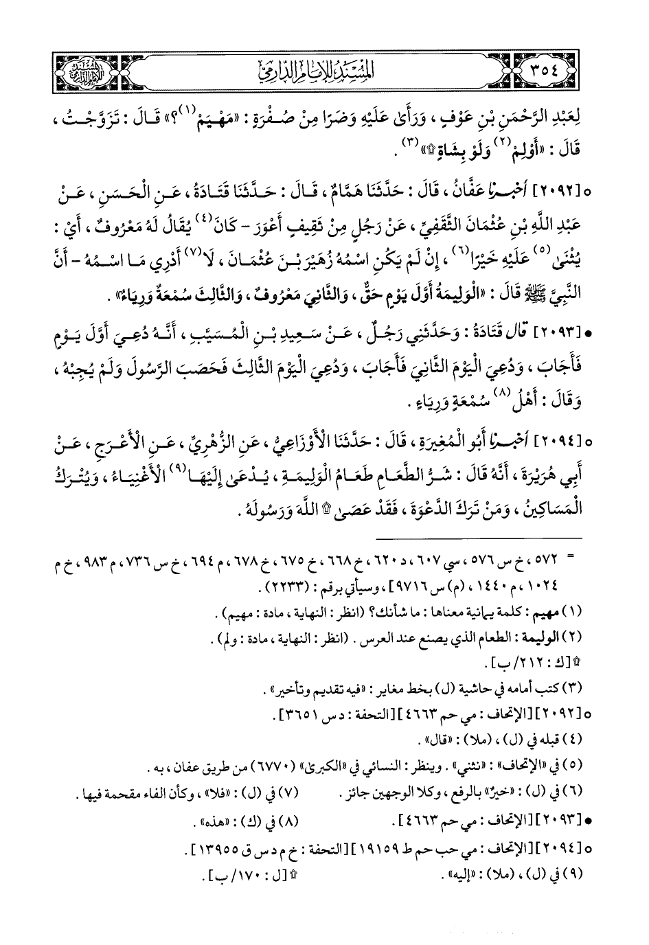 2092- أَخبَرَنا عَفَّانُ, قَالَ: حَدَّثَنَا هَمَّامٌ, قَالَ: حَدَّثَنَا قَتَادَةُ, عَنِ الْحَسَنِ, عَنْ عَبْدِ اللهِ بْنِ عُثْمَانَ الثَّقَفِيِّ, عَنْ رَجُلٍ مِنْ ثَقِيفَ أَعْوَرَ, كَانَ يُقَالُ لَهُ: مَعْرُوفٌ, أَيْ يُثْنَى عَلَيْهِ خَيْرًا, إِنْ لَمْ يَكُنِ اسْمُهُ زُهَيْرَ بْنَ عُثْمَانَ, لاَ (1) أَدْرِي مَا اسْمُهُ, أَنَّ النَّبِيَّ صَلى الله عَليهِ وسَلم, قَالَ: الْوَلِيمَةُ أَوَّلَ يَوْمٍ حَقٌّ, وَالثَّانِيَ مَعْرُوفٌ, وَالثَّالِثَ سُمْعَةٌ وَرِيَاءٌ.