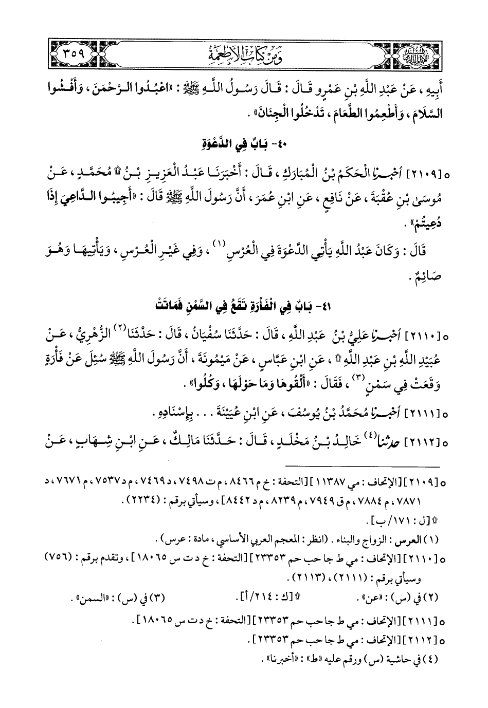 - قَالَ: وَكَانَ عَبْدُ اللهِ يَأْتِي الدَّعْوَةَ فِي الْعُرْسِ, وَفِي غَيْرِ الْعُرْسِ, وَيَأْتِيهَا وَهُوَ صَائِمٌ.