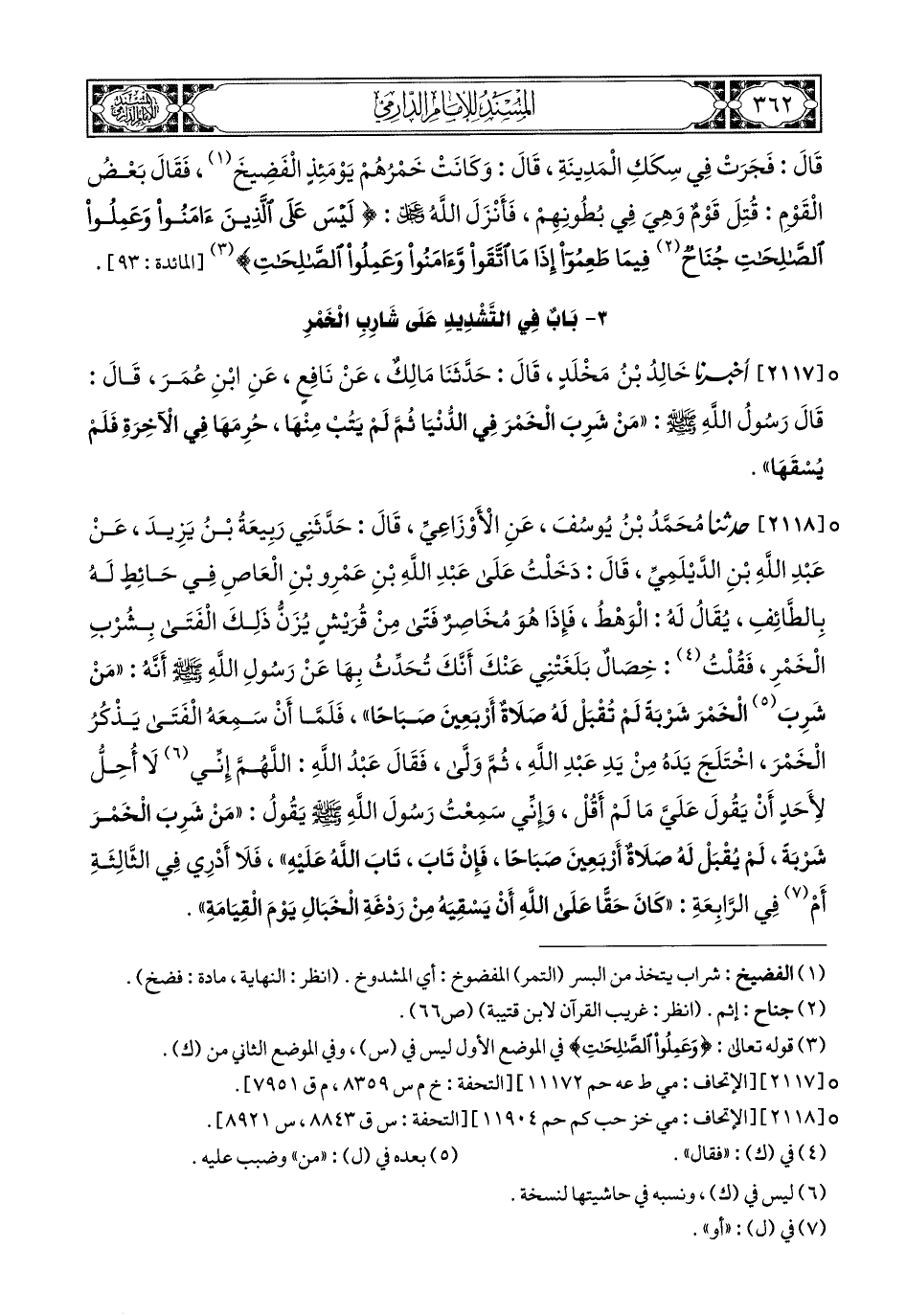 2118- حَدَّثَنَا مُحَمَّدُ بْنُ يُوسُفَ, عَنِ الأَوْزَاعِيِّ, قَالَ: حَدَّثَنِي رَبِيعَةُ بْنُ يَزِيدَ, عَنْ عَبْدِ اللهِ بْنِ الدَّيْلَمِيِّ, قَالَ: دَخَلْتُ عَلَى عَبْدِ اللهِ بْنِ عَمْرِو بْنِ الْعَاصِ فِي حَائِطٍ لَهُ بِالطَّائِفِ, يُقَالُ لَهُ: الْوَهْطُ, فَإِذَا هُوَ مُخَاصِرٌ فَتًى مِنْ قُرَيْشٍ, يُزَنُّ ذَلِكَ الْفَتَى بِشُرْبِ الْخَمْرِ, فَقُلْتُ: خِصَالٌ بَلَغَتْنِي عَنْكَ, أَنَّكَ تُحَدِّثُ بِهَا عَنْ رَسُولِ اللهِ صَلى الله عَليهِ وسَلم أَنَّهُ: مَنْ شَرِبَ الْخَمْرَ شَرْبَةً لَمْ تُقْبَلْ لَهُ صَلاَةٌ أَرْبَعِينَ صَبَاحًا, فَلَمَّا أَنْ سَمِعَهُ الْفَتَى يَذْكُرُ الْخَمْرَ, اخْتَلَجَ يَدَهُ مِنْ يَدِ عَبْدِ اللهِ, ثُمَّ وَلَّى, فَقَالَ عَبْدُ اللهِ: اللهُمَّ إِنِّي لاَ أُحِلُّ لأَحَدٍ أَنْ يَقُولَ عَلَيَّ مَا لَمْ أَقُلْ, وَإِنِّي سَمِعْتُ رَسُولَ اللهِ صَلى الله عَليهِ وسَلم يَقُولُ: مَنْ شَرِبَ الْخَمْرَ شَرْبَةً لَمْ يُقْبَلْ (1) لَهُ صَلاَةٌ أَرْبَعِينَ صَبَاحًا, فَإِنْ تَابَ تَابَ اللهُ عَلَيْهِ, فَلاَ أَدْرِي فِي الثَّالِثَةِ, أَمْ (2) فِي الرَّابِعَةِ: كَانَ حَقًّا عَلَى اللهِ أَنْ يَسْقِيَهُ مِنْ رَدْغَةِ الْخَبَالِ يَوْمَ الْقِيَامَةِ.