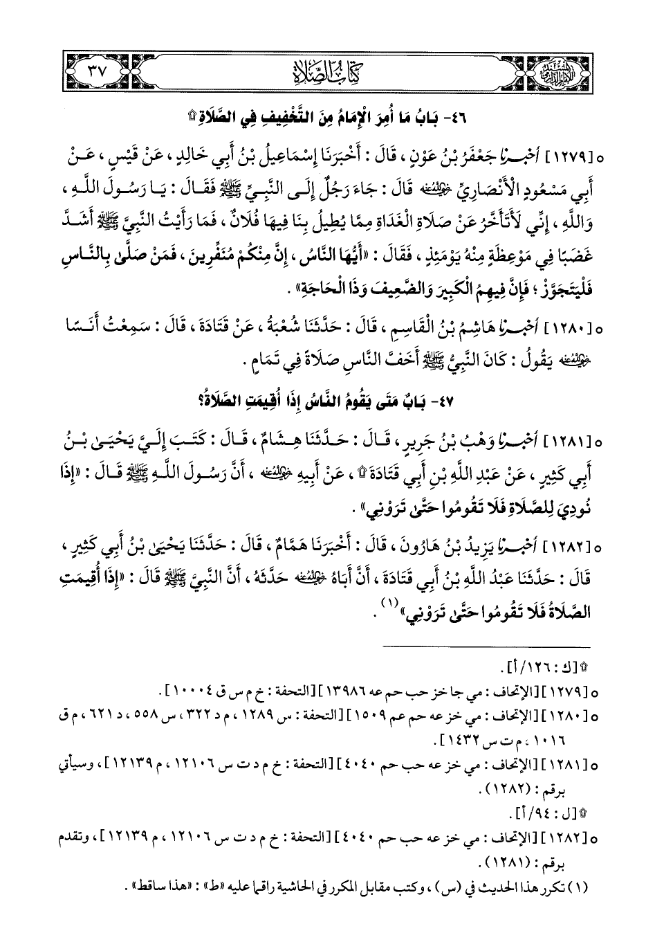 1280- أَخبَرَنا هَاشِمُ بْنُ الْقَاسِمِ, قَالَ: حَدَّثَنَا شُعْبَةُ, عَنْ قَتَادَةَ, قَالَ: سَمِعْتُ أَنَسًا رَضِيَ اللهُ عَنْهُ يَقُولُ: كَانَ النَّبِيُّ صَلى الله عَليهِ وسَلم أَخَفَّ النَّاسِ صَلاَةً فِي تَمَامٍ.