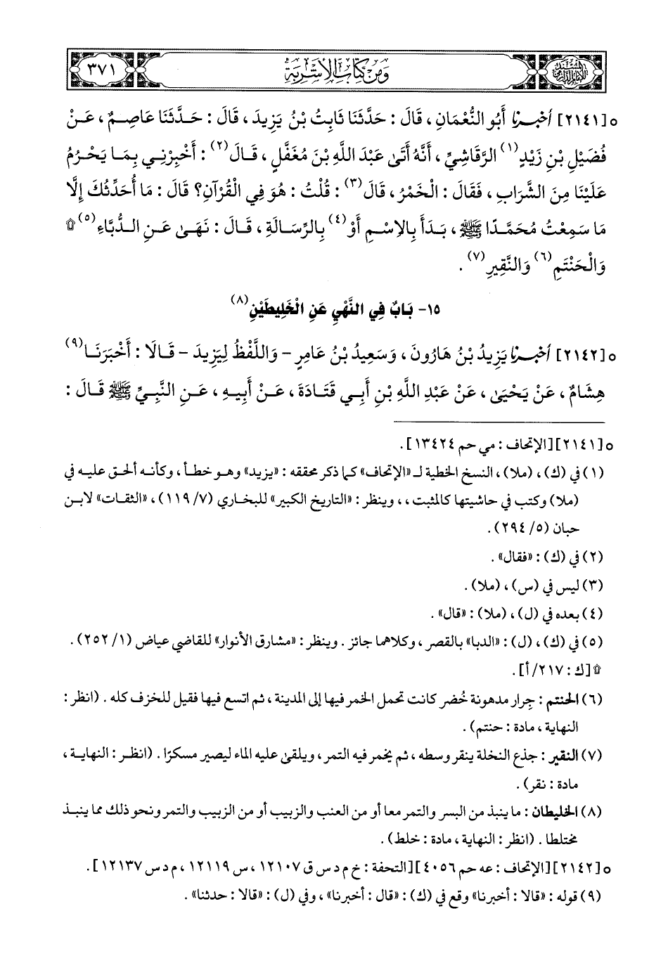 2142- أَخبَرَنا يَزِيدُ بْنُ هَارُونَ, وَسَعِيدُ بْنُ عَامِرٍ, وَاللَّفْظُ لِيَزِيدَ, قَالاَ: أَخبَرَنا هِشَامٌ, عَنْ يَحْيَى, عَنْ عَبْدِ اللهِ بْنِ أَبِي قَتَادَةَ, عَنْ أَبِيهِ, عَنِ النَّبِيِّ صَلى الله عَليهِ وسَلم, قَالَ: لاَ تَنْتَبِذُوا الزَّهْوَ وَالرُّطَبَ جَمِيعًا, وَلاَ تَنْتَبِذُوا الزَّبِيبَ وَالتَّمْرَ جَمِيعًا, وَانْتَبِذُوا كُلَّ وَاحِدٍ مِنْهُمَا عَلَى حِدَتِهِ (1) (2).