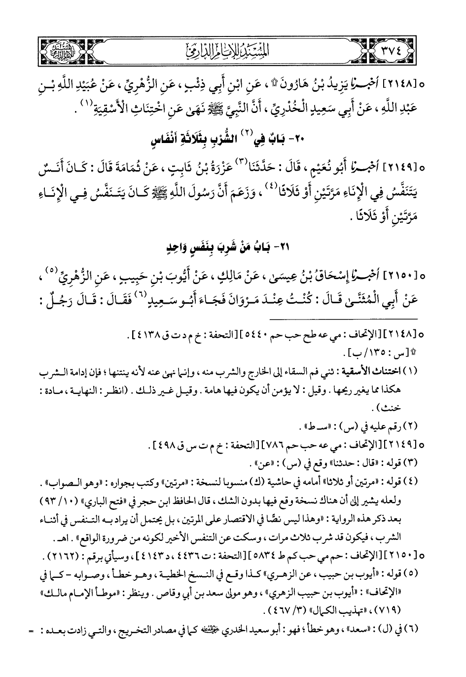 (2) زاد هنا في طبعة دار البشائر بين قوسين: "فَقَالَ لَهُ مَرْوَانُ: سَمِعْتَ مِنْ رَسُولَ اللهِ صَلى الله عَلَيه وسَلم أَنَّهُ نَهَى عَنِ النَّفْخِ فِي الشَّرَابِ؟ فَقَالَ أَبُو سَعِيدٍ: نَعَمْ", وقال محققها: ما بين القوسين سقط من جميع النُّسَخ, واستدركنا الساقط من رواية المصنف حيث أعاده باختصار في باب النهي عن النفخ في الشراب ومقابلة ذلك بما في الموطأ, حيث أخرجه المصنف من طريقه.