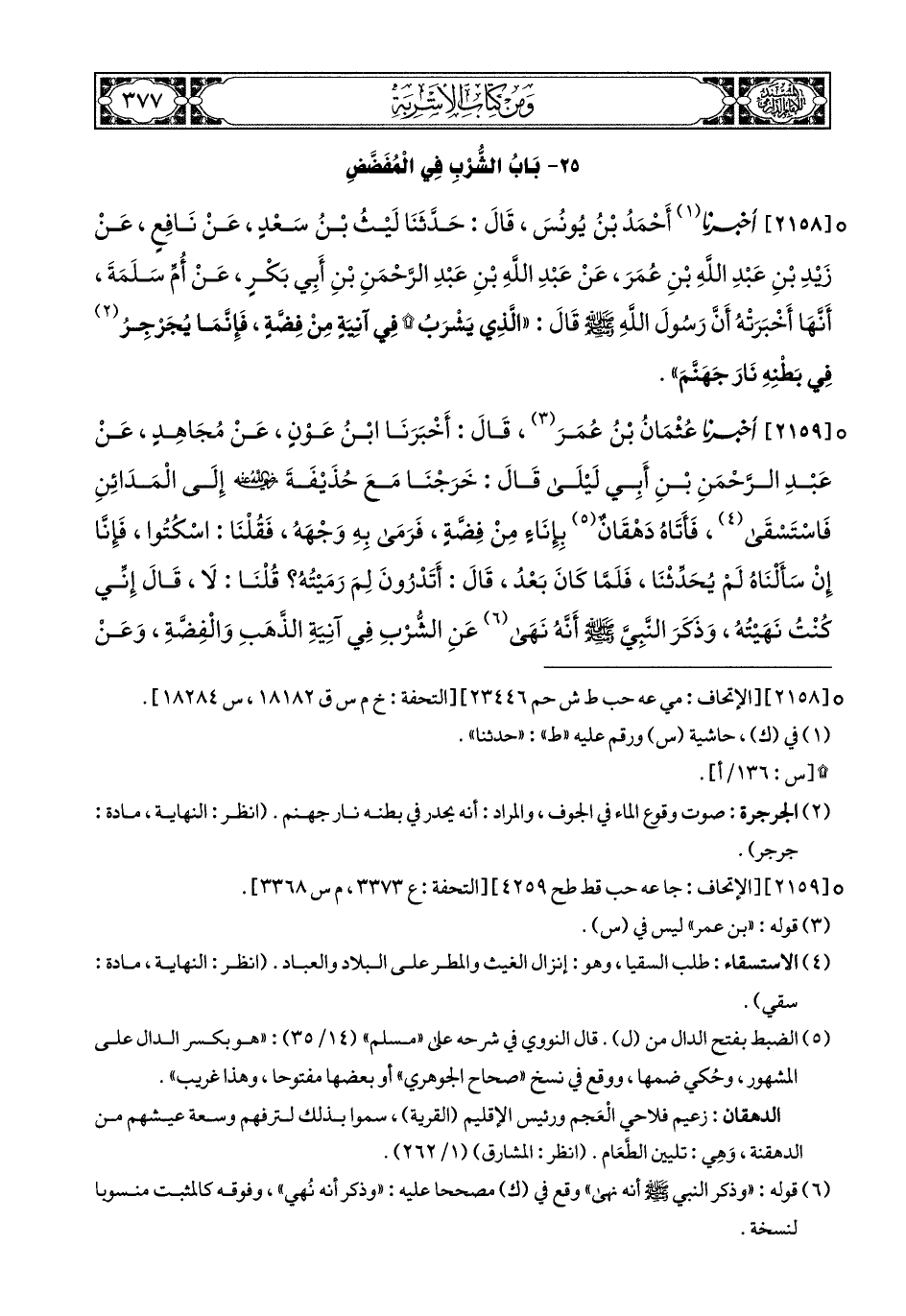2158- أَخبَرَنا أَحْمَدُ بْنُ يُونُسَ, قَالَ: حَدَّثَنَا لَيْثُ بْنُ سَعْدٍ, عَنْ نَافِعٍ, عَنْ زَيْدِ بْنِ عَبْدِ اللهِ بْنِ عُمَرَ, عَنْ عَبْدِ اللهِ بْنِ عَبْدِ الرَّحْمَنِ بْنِ أَبِي بَكْرٍ, عَنْ أُمِّ سَلَمَةَ أَنَّهَا أَخْبَرَتْهُ, أَنَّ رَسُولَ اللهِ صَلى الله عَليهِ وسَلم قَالَ: الَّذِي يَشْرَبُ فِي آنِيَةٍ مِنْ فِضَّةٍ, فَإِنَّمَا يُجَرْجِرُ فِي بَطْنِهِ نَارَ جَهَنَّمَ.