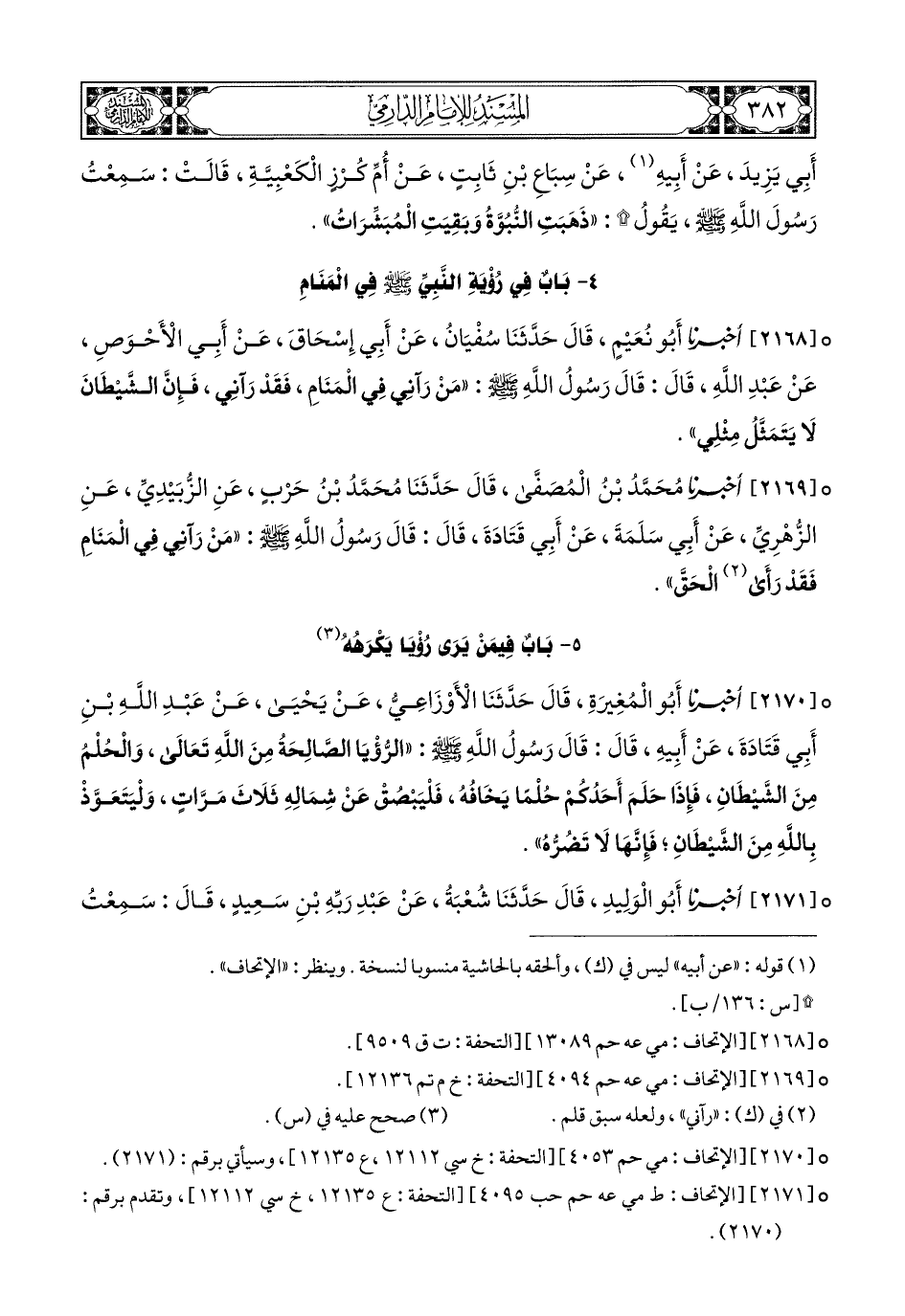 (1) قال محقق طبعة دار البشائر: انتهى كتاب الرؤيا عند هذا الحديث إلا من: "غ. ولي. م. م".