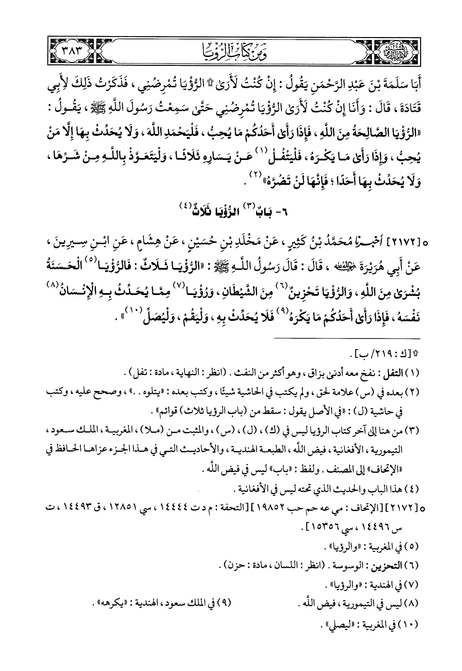 2172- أَخبَرَنا مُحَمَّدُ بْنُ كَثِيرٍ, عَنْ مَخْلَدِ بْنِ حُسَيْنٍ, عَنْ هِشَامٍ, عَنِ ابْنِ سِيرِينَ, عَنْ أَبِي هُرَيْرَةَ رَضِيَ اللهُ عَنْهُ, قَالَ: قَالَ رَسُولُ اللهِ صَلى الله عَليهِ وسَلم: الرُّؤْيَا ثَلاَثٌ: فَالرُّؤْيَا الْحَسَنَةُ بُشْرَى مِنَ اللهِ, وَالرُّؤْيَا تَحْزِينٌ مِنَ الشَّيْطَانِ, وَرُؤْيَا مِمَّا يُحَدِّثُ بِهِ الإِنْسَانُ نَفْسَهُ, فَإِذَا رَأَى أَحَدُكُمْ مَا يَكْرَهُ (1), فَلاَ يُحَدِّثْ بِهِ, وَلْيَقُمْ, وَلْيُصَلِّ.