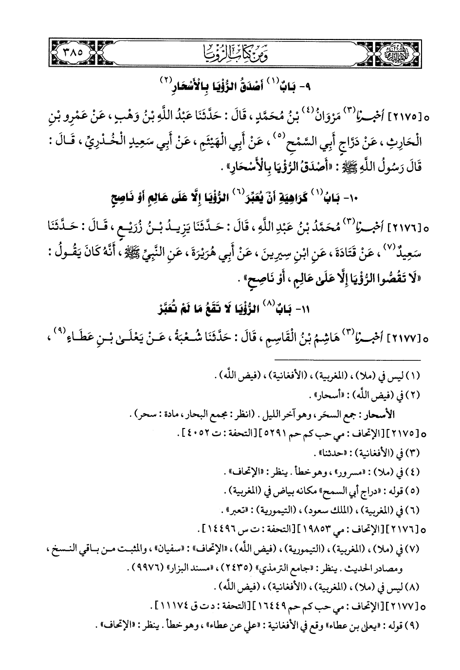 2175- أَخبَرَنا مَرْوَانُ بْنُ مُحَمَّدٍ, قَالَ: حَدَّثَنَا عَبْدُ اللهِ بْنُ وَهْبٍ, عَنْ عَمْرِو بْنِ الْحَارِثِ, عَنْ دَرَّاجٍ أَبِي السَّمْحِ (1), عَنْ أَبِي الْهَيْثَمِ, عَنْ أَبِي سَعِيدٍ الْخُدْرِيِّ, قَالَ: قَالَ رَسُولُ اللهِ صَلى الله عَليهِ وسَلم: أَصْدَقُ الرُّؤْيَا بِالأَسْحَارِ.