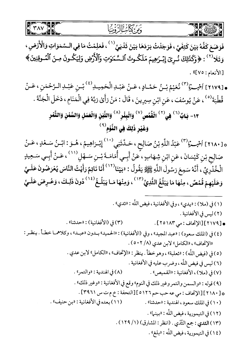 13- باب في القمص والبئر واللبن والعسل والسمن والتمر (1) وغير ذلك في النوم.