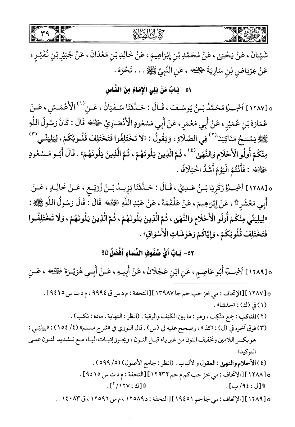 1287- أَخبَرَنا مُحَمَّدُ بْنُ يُوسُفَ, قَالَ: حَدَّثَنَا سُفْيَانُ, عَنِ الأَعْمَشِ, عَنْ عُمَارَةَ بْنِ عُمَيْرٍ, عَنْ أَبِي مَعْمَرٍ, عَنْ أَبِي مَسْعُودٍ الأَنْصَارِيِّ رَضِيَ اللهُ عَنْهُ, قَالَ: كَانَ رَسُولُ اللهِ صَلى الله عَليهِ وسَلم يَمْسَحُ مَنَاكِبَنَا فِي الصَّلاَةِ وَيَقُولَ: لاَ تَخْتَلِفُوا, فَتَخْتَلِفَ قُلُوبُكُمْ, لِيَلِيَنِّي مِنْكُمْ أُولُو الأَحْلاَمِ وَالنُّهَى, ثُمَّ الَّذِينَ يَلُونَهُمْ, ثُمَّ الَّذِينَ يَلُونَهُمْ.