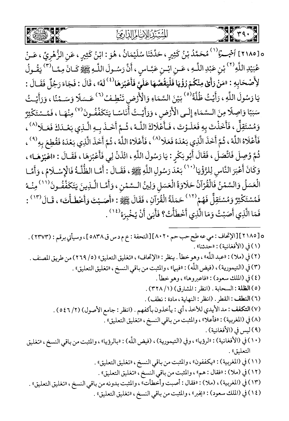 2185- أَخبَرَنا مُحَمَّدُ بْنُ كَثِيرٍ, حَدَّثَنَا سُلَيْمَانُ, هُوَ ابْنُ كَثِيرٍ, عَنِ الزُّهْرِيِّ, عَنْ عُبَيْدِ اللهِ بْنِ عَبْدِ اللهِ, عَنِ ابْنِ عَبَّاسٍ, أَنَّ رَسُولَ اللهِ صَلى الله عَليه وسَلم كَانَ مِمَّا يَقُولُ لِأَصْحَابهِ: مَنْ رَأَى مِنْكُمْ رُؤْيَا, فَلْيَقُصَّهَا عَلَيَّ, فَأَعْبُرَهَا لَهُ, قَالَ: فَجَاءَ رَجُلٌ, فَقَالَ: يَا رَسُولَ اللهِ, رَأَيْتُ ظُلَّةً بَيْنَ السَّمَاءِ وَالأَرْضِ, تَنْطِفُ عَسَلاً وَسَمْنًا, وَرَأَيْتُ سَبَبًا وَاصِلاً مِنَ السَّمَاءِ إِلَى الأَرْضِ, وَرَأَيْتُ أُنَاسًا يَتَكَفَّفُونَ مِنْهَا, فَمُسْتَكْثِرٌ, وَمُسْتَقِلٌّ, فَأَخَذْتَ بِهِ فَعَلَوْتَ, فَأَعْلَاكَ اللهُ, ثُمَّ أَخَذَ بِهِ الَّذِي بَعْدَكَ (فَعَلَا, فَأَعْلَاهُ اللهُ, ثُمَّ أَخَذَ الَّذِي بَعْدَهُ فَعَلَا, فَأَعْلَاهُ اللهُ, ثُمَّ أَخَذَهُ الَّذِي بَعْدَهُ, فَقُطِعَ بِهِ, ثُمَّ وُصِلَ, فَاتَّصَلَ, فَقَالَ أَبُو بَكْرٍ: يَا رَسُولَ اللهِ, ائْذَنْ لِي فَأَعْبُرَهَا, فَقَالَ: اعْبُرْهَا, وَكَانَ أَعْبَرَ النَّاسِ لِلرُّؤْيَا بَعْدَ رَسُولِ اللهِ صَلى الله عَليه وسَلم, فَقَالَ: أَمَّا الظُّلَّةُ فَالإِسلَامُ, وَأَمَّا الْعَسَلُ وَالسَّمْنُ, فَالْقُرْآنُ حَلَاوَةُ الْعَسَلِ, وَلِينُ السَّمْنِ, وَأَمَّا الَّذِينَ يَتَكَفَّفُونَ مِنْهُ, فَمُسْتَكْثِرٌ وَمُسْتَقِلٌّ, فَهُمْ حَمَلَةُ الْقُرْآنِ, فَقَالَ صَلى الله عَليه وسَلم: أَصَبْتَ وَأَخْطَأْتَ, قَالَ: فَمَا الَّذِي أَصَبْتُ, وَمَا الَّذِي أَخْطَأْتُ؟ فَأَبَى أَنْ يُخْبِرَهُ (1).