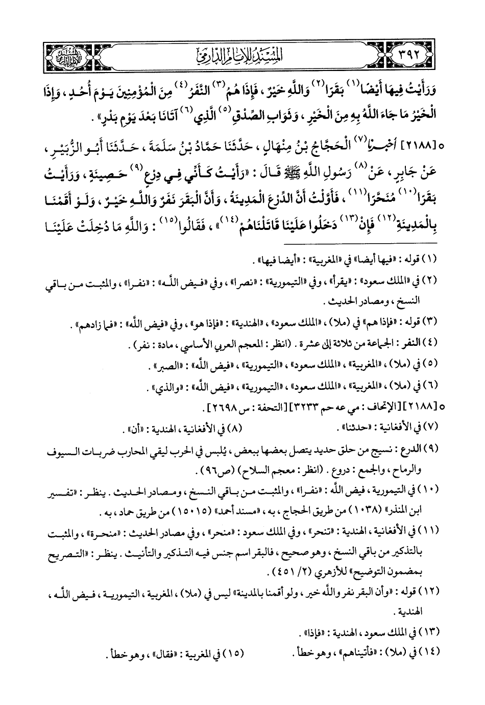 2188- أَخبَرَنا الْحَجَّاجُ بْنُ مِنْهَالٍ, حَدَّثَنَا حَمَّادُ بْنُ سَلَمَةَ, حَدَّثَنَا أَبُو الزُّبَيْرِ, عَنْ جَابِرٍ, عَنْ (1) رَسُولِ اللهِ صَلى الله عَليهِ وسَلم قَالَ: رَأَيْتُ كَأَنِّي فِي دِرْعٍ حَصِينَةٍ, وَرَأَيْتُ بَقَرًا مُنَحَّرًا (2), فَأَوَّلْتُ أَنَّ الدِّرْعَ الْمَدِينَةُ, وَأَنَّ الْبَقَرَ نَفَرٌ وَاللهِ خَيْرٌ, وَلَوْ أَقَمْنَا بِالْمَدِينَةِ, فَإِنْ (3) دَخَلُوا عَلَيْنَا قَاتَلْنَاهُمْ, فَقَالُوا: وَاللهِ مَا دُخِلَتْ عَلَيْنَا فِي الْجَاهِلِيَّةِ (4), فَتُدْخَلُ (5) عَلَيْنَا فِي الإِسْلاَمِ, قَالَ: فَشَأْنَكُمْ إِذًا, وَقَالَتِ الأَنْصَارُ بَعْضُهَا لِبَعْضٍ: رَدَدْنَا عَلَى النَّبِيِّ صَلى الله عَليهِ وسَلم رَأْيَهُ, فَجَاؤُوا, فَقَالُوا: يَا رَسُولَ اللهِ, شَأْنُكَ, فَقَالَ: الآنَ, إِنَّهُ لَيْسَ لِنَبِيٍّ إِذَا لَبِسَ لأْمَتَهُ أَنْ يَضَعَهُ (6) حَتَّى يُقَاتِلَ.