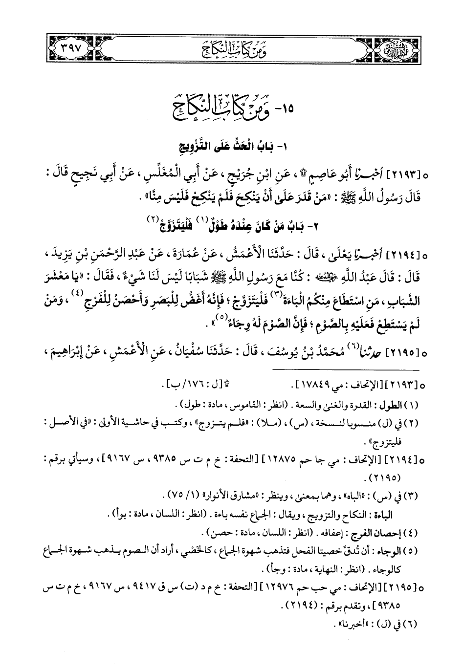 2195- حَدَّثَنَا مُحَمَّدُ بْنُ يُوسُفَ, قَالَ: حَدَّثَنَا سُفْيَانُ, عَنِ الأَعْمَشِ, عَنْ إِبْرَاهِيمَ, عَنْ عَلْقَمَةَ, عَنْ عَبْدِ اللهِ رَضِيَ اللهُ عَنْهُ, قَالَ: لَقِيَهُ عُثْمَانُ رضوان الله عليه, وَأَنَا مَعَهُ, فَقَالَ لَهُ: يَا أَبَا عَبْدِ الرَّحْمَنِ, هَلْ لَكَ فِي جَارِيَةٍ بِكْرٍ تُذَكِّرُكَ؟ فَقَالَ: لَئِنْ قُلْتَ ذَاكَ, لَقَدْ سَمِعْتُ رَسُولَ اللهِ صَلى الله عَليهِ وسَلم يَقُولُ: يَا مَعْشَرَ الشَّبَابِ, مَنِ اسْتَطَاعَ (1) مِنْكُمُ الْبَاءَةَ فَلْيَتَزَوَّجْ, فَإِنَّهُ أَغَضُّ لِلْبَصَرِ وَأَحْصَنُ لِلْفَرْجِ, وَمَنْ لَمْ يَسْتَطِعْ فَلْيَصُمْ, فَإِنَّ الصَّوْمَ لَهُ وِجَاءٌ.
