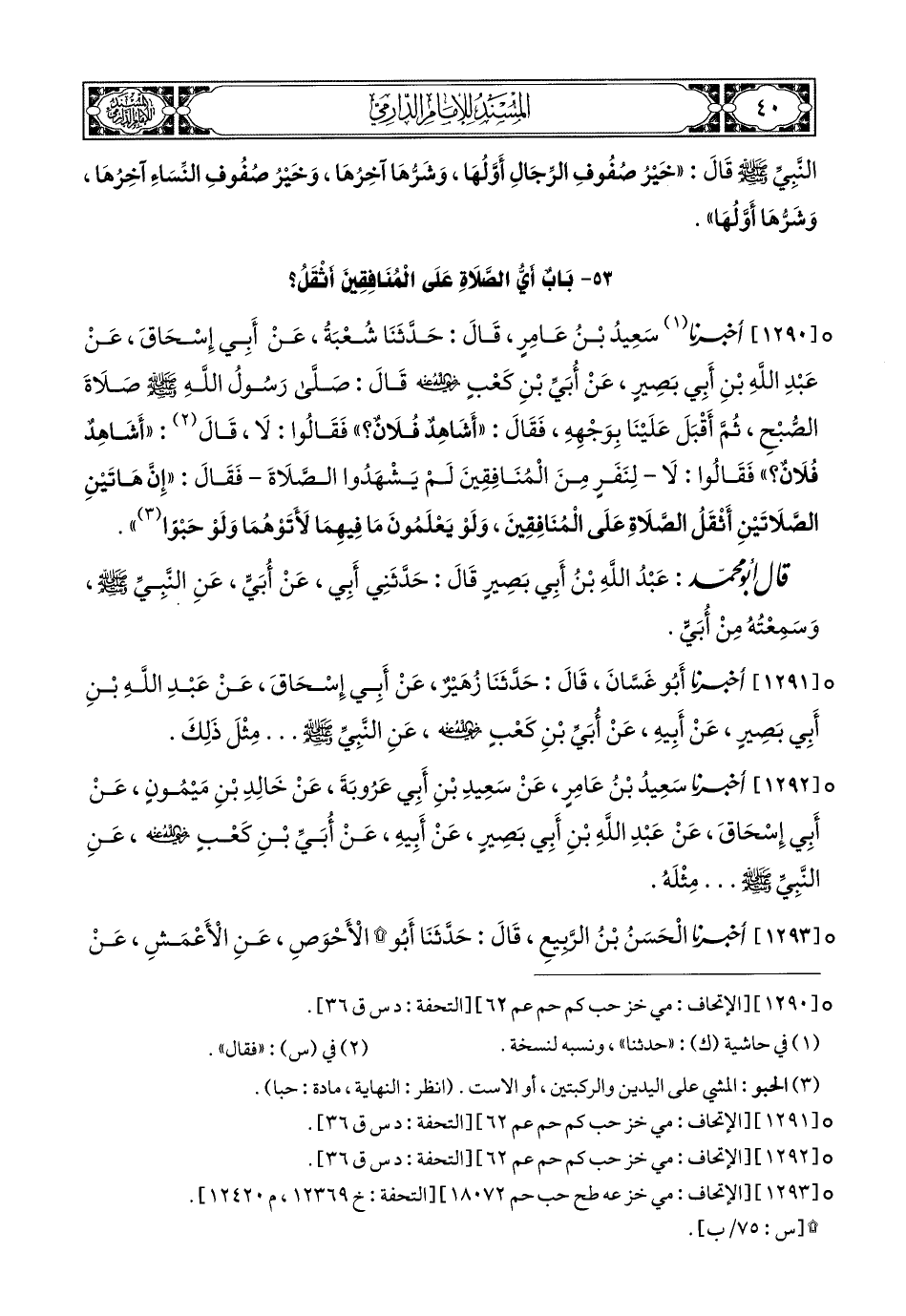 1290- أَخبَرَنا سَعِيدُ بْنُ عَامِرٍ, قَالَ: حَدَّثَنَا شُعْبَةُ, عَنْ أَبِي إِسْحَاقَ, عَنْ عَبْدِ اللهِ بْنِ أَبِي بَصِيرٍ, عَنْ أُبَيِّ بْنِ كَعْبٍ رَضِيَ اللهُ عَنْهُ, قَالَ: صَلَّى رَسُولُ اللهِ صَلى الله عَليهِ وسَلم صَلاَةَ الصُّبْحِ, ثُمَّ أَقْبَلَ عَلَيْنَا بِوَجْهِهِ, فَقَالَ: أَشَاهِدٌ فُلاَنٌ؟ فَقَالُوا (1): لاَ, قَالَ: أَشَاهِدٌ فُلاَنٌ؟, فَقَالُوا: لاَ, لِنَفَرٍ مِنَ الْمُنَافِقِينَ لَمْ يَشْهَدُوا الصَّلاَةَ, فَقَالَ: إِنَّ هَاتَيْنِ الصَّلاَتَيْنِ أَثْقَلُ الصَّلاَةِ عَلَى الْمُنَافِقِينَ, وَلَوْ يَعْلَمُوا مَا فِيهِمَا لأَتَوْهُمَا وَلَوْ حَبْوًا.