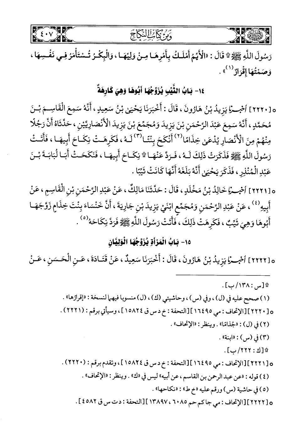 2220- أَخبَرَنا يَزِيدُ بْنُ هَارُونَ, قَالَ: أَخبَرَنا يَحْيَى بْنُ سَعِيدٍ, أَنَّهُ سَمِعَ الْقَاسِمَ بْنَ مُحَمَّدٍ, أَنَّهُ سَمِعَ عَبْدَ الرَّحْمَنِ بْنَ يَزِيدَ, وَمُجَمِّعَ بْنَ يَزِيدَ الأَنْصَارِيَّيْنِ حَدَّثَاهُ, أَنَّ رَجُلاً مِنْهُمْ مِنَ الأَنْصَارِ يُدْعَى: خِذَامًا أَنْكَحَ بِنْتًا لَهُ, فَكَرِهَتْ نِكَاحَ أَبِيهَا, فَأَتَتْ رَسُولَ اللهِ صَلى الله عَليهِ وسَلم, فَذَكَرَتْ ذَلِكَ لَهُ, فَرَدَّ عَنْهَا نِكَاحَ أَبِيهَا, فَنَكَحَتْ أَبَا لُبَابَةَ بْنَ عَبْدِ الْمُنْذِرِ.
