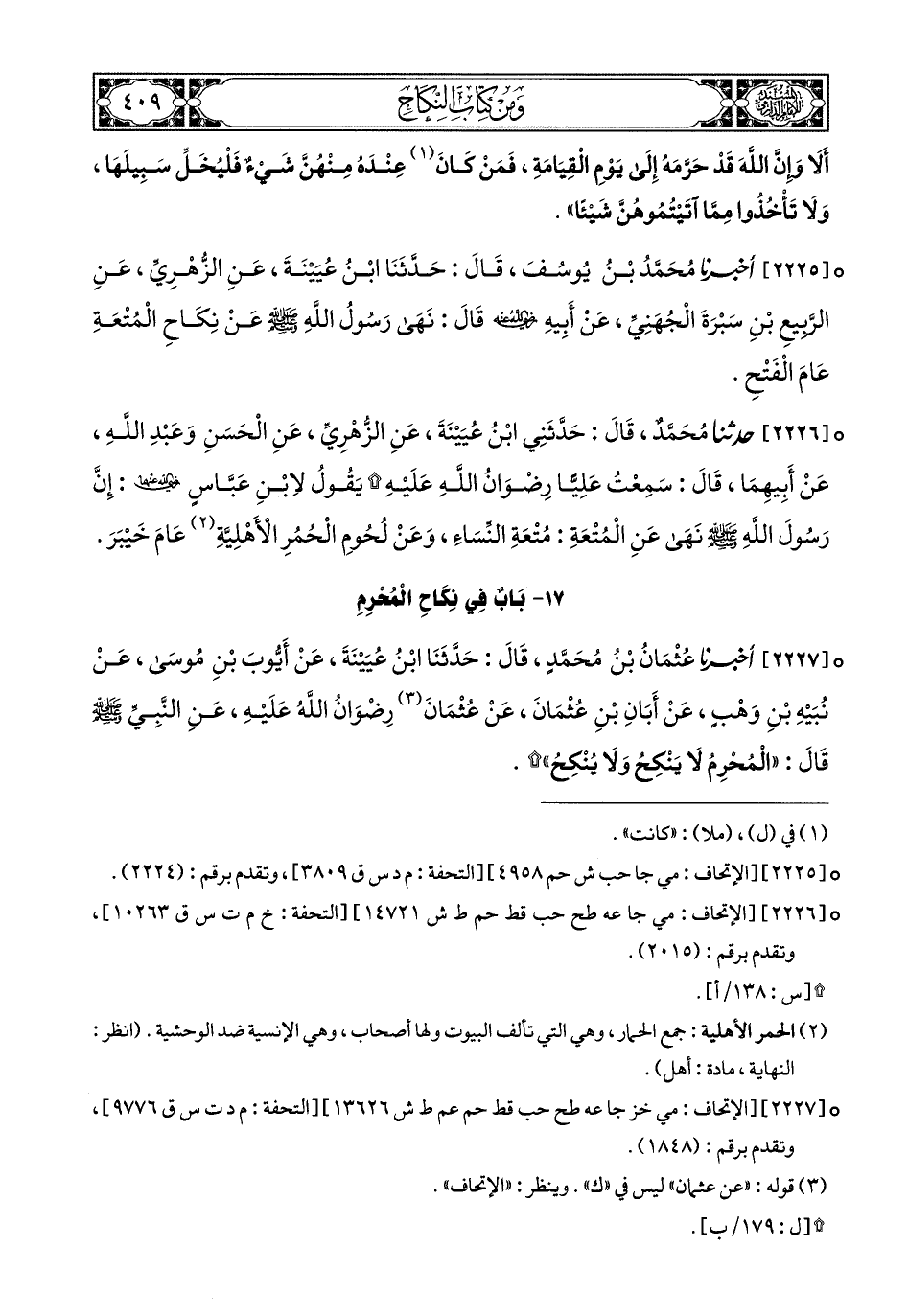 2226- حَدَّثَنَا مُحَمَّدٌ, قَالَ: حَدَّثَنَي ابْنُ عُيَيْنَةَ, عَنِ الزُّهْرِيِّ, عَنِ الْحَسَنِ, وَعَبْدِ اللهِ, عَنْ أَبِيهِمَا قَالَ: سَمِعْتُ عَلِيًّا رضوان الله عليه يَقُولُ لاِبْنِ عَبَّاسٍ رَضِيَ اللهُ عَنْهُمَا: إِنَّ رَسُولَ اللهِ صَلى الله عَليهِ وسَلم نَهَى عَنِ الْمُتْعَةِ مُتْعَةِ النِّسَاءِ, وَعَنْ لُحُومِ الْحُمُرِ الأَهْلِيَّةِ عَامَ خَيْبَرَ.