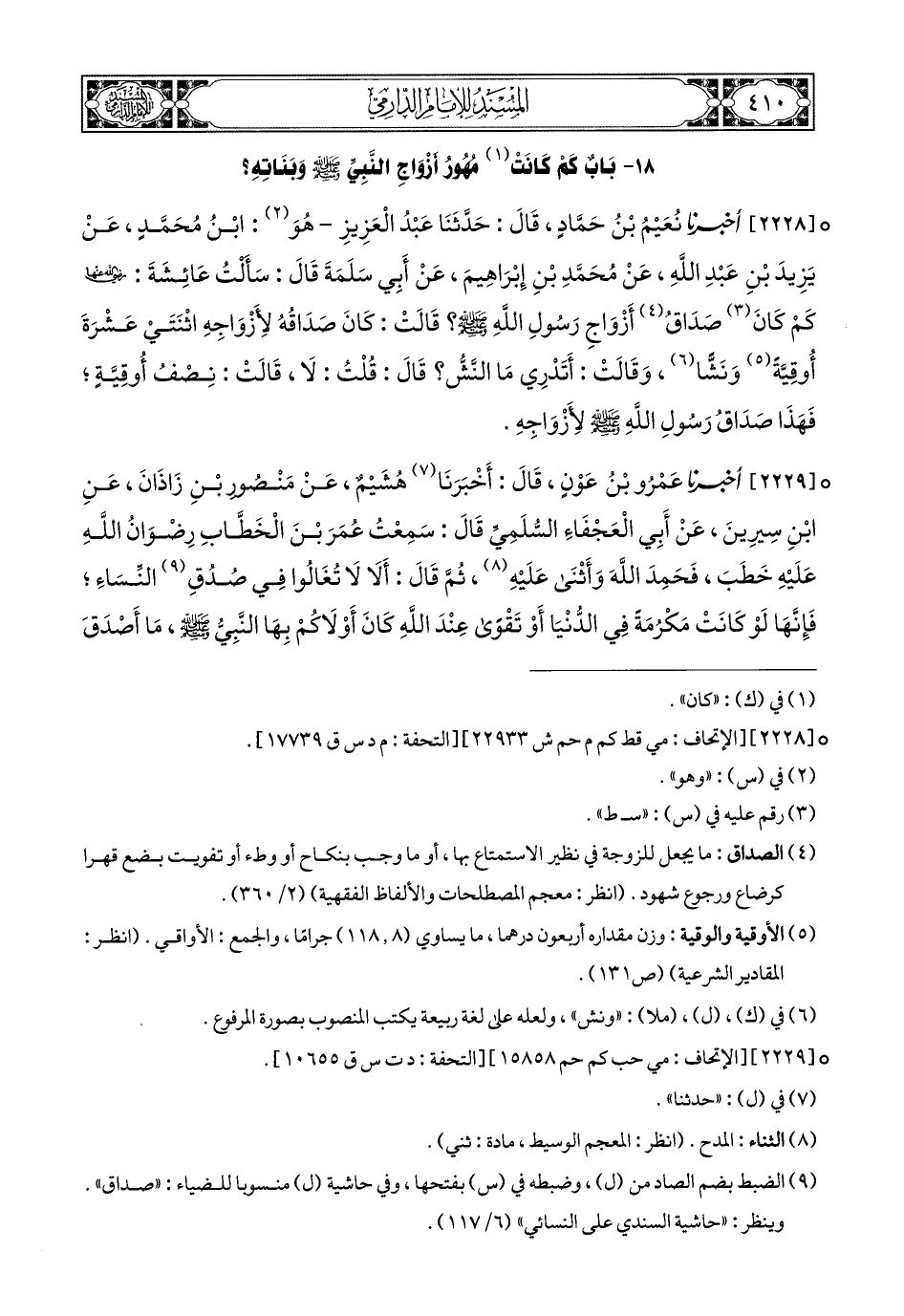 2228- أَخبَرَنا نُعَيْمُ بْنُ حَمَّادٍ, قَالَ: حَدَّثَنَا عَبْدُ الْعَزِيزِ, هُوَ ابْنُ مُحَمَّدٍ (1), عَنْ يَزِيدَ بْنِ عَبْدِ اللهِ, عَنْ مُحَمَّدِ بْنِ إِبْرَاهِيمَ, عَنْ أَبِي سَلَمَةَ, قَالَ: سَأَلْتُ عَائِشَةَ رَضِيَ اللهُ عَنْهَا: كَمْ كَانَ صَدَاقُ أَزْوَاجِ رَسُولِ اللهِ صَلى الله عَليهِ وسَلم؟ قَالَتْ: كَانَ صَدَاقُهُ لأَزْوَاجِهِ اثْنَتَيْ عَشْرَةَ أُوقِيَّةً وَنَشًّا, وَقَالَتْ: أَتَدْرِي مَا النَّشُّ؟ قَالَ: قُلْتُ: لاَ, قَالَتْ: نِصْفُ أُوقِيَّةٍ, فَهَذَا صَدَاقُ رَسُولِ اللهِ صَلى الله عَليهِ وسَلم لأَزْوَاجِهِ.