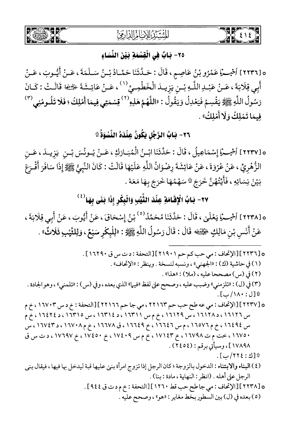 2238- أَخبَرَنا يَعْلَى, قَالَ: حَدَّثَنَا مُحَمَّدُ بْنُ إِسْحَاقَ (2), عَنْ أَيُّوبَ, عَنْ أَبِي قِلاَبَةَ, عَنْ أَنَسِ بْنِ مَالِكٍ رَضِيَ اللهُ عَنْهُ قَالَ: قَالَ رَسُولُ الله صَلى الله عليه وسلم: لِلْبِكْرِ سَبْعٌ, وَلِلثَّيِّبِ ثَلاَثٌ.