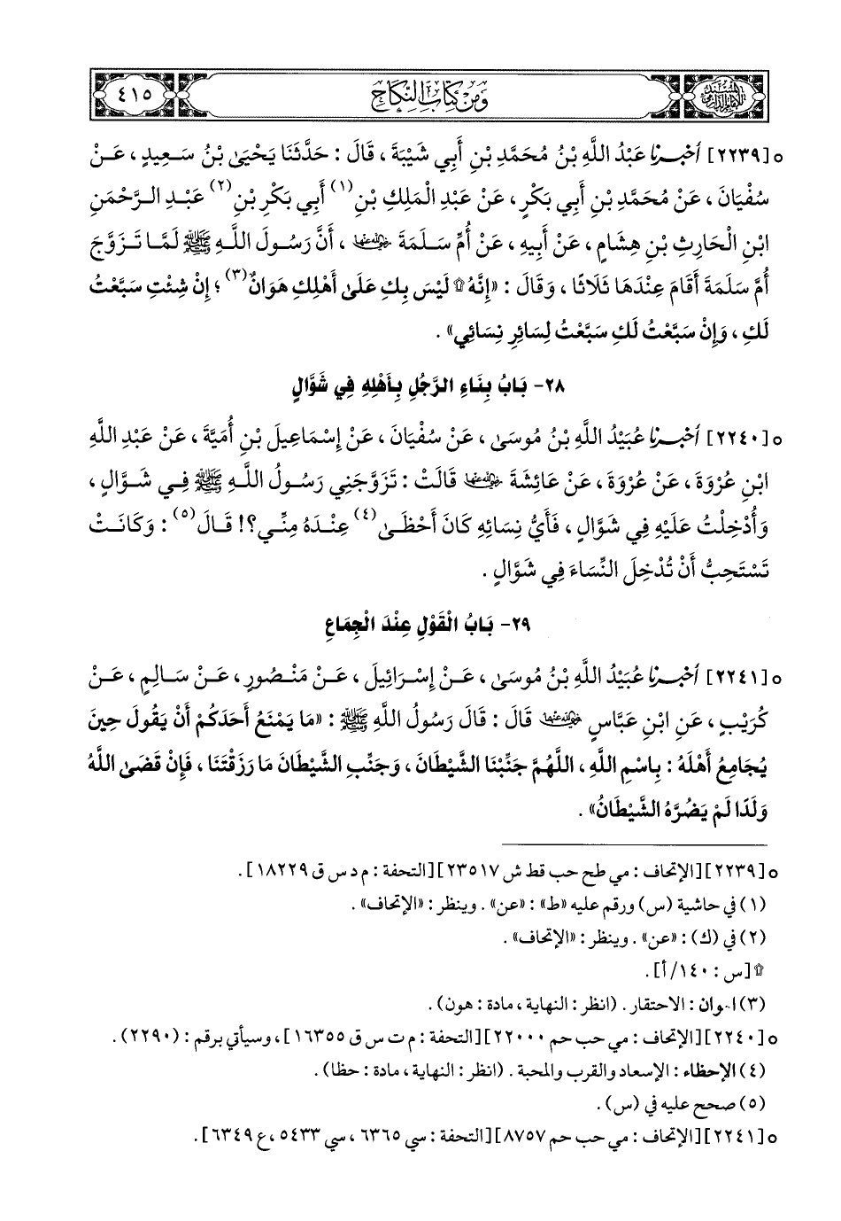 2239- أَخبَرَنا عَبْدُ اللهِ بْنُ مُحَمَّدِ بْنِ أَبِي شَيْبَةَ, قَالَ: حَدَّثَنَا يَحْيَى بْنُ سَعِيدٍ, عَنْ سُفْيَانَ, عَنْ مُحَمَّدِ بْنِ أَبِي بَكْرٍ, عَنْ عَبْدِ الْمَلِكِ بْنِ أَبِي بَكْرِ بْنِ عَبْدِ الرَّحْمَنِ بْنِ الْحَارِثِ بْنِ هِشَامٍ, عَنْ أَبِيهِ, عَنْ أُمِّ سَلَمَةَ رَضِيَ اللهُ عَنْهَا, أَنَّ رَسُولَ اللهِ صَلى الله عَليهِ وسَلم لَمَّا تَزَوَّجَ أُمَّ سَلَمَةَ, أَقَامَ عِنْدَهَا ثَلاَثًا, وَقَالَ: إِنَّهُ لَيْسَ بِكِ عَلَى أَهْلِكِ هَوَانٌ, إِنْ شِئْتِ سَبَّعْتُ لَكِ, وَإِنْ سَبَّعْتُ لَكِ سَبَّعْتُ لِسَائِرِ نِسَائِي.