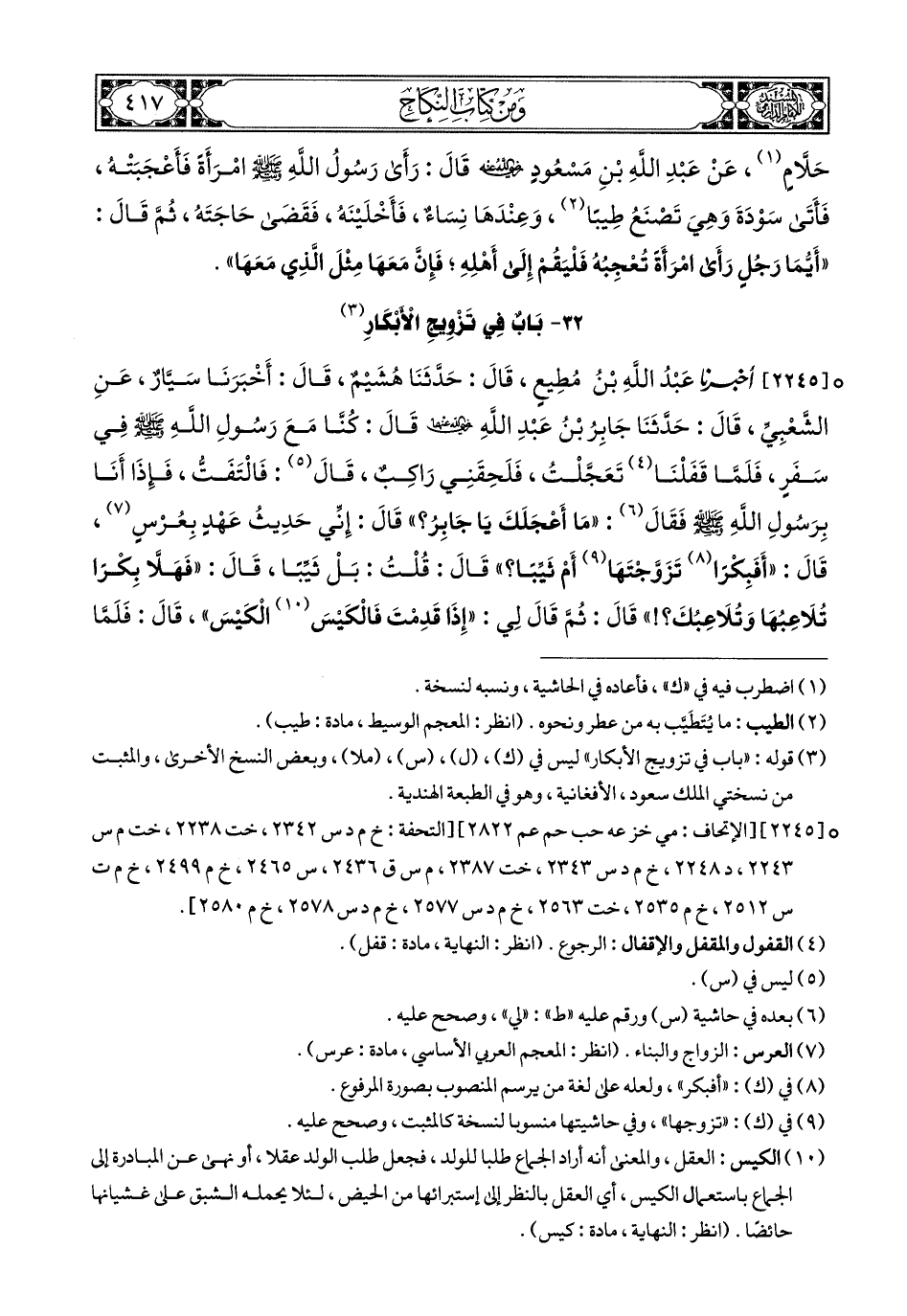 2245- أَخبَرَنا عَبْدُ اللهِ بْنُ مُطِيعٍ, قَالَ: حَدَّثَنَا هُشَيْمٌ, قَالَ: أَخبَرَنا سَيَّارٌ, عَنِ الشَّعْبِيِّ, قَالَ: حَدَّثَنَا جَابِرُ بْنُ عَبْدِ اللهِ رَضِيَ اللهُ عَنْهُمَا, قَالَ: كُنَّا مَعَ رَسُولِ اللهِ صَلى الله عَليهِ وسَلم فِي سَفَرٍ, فَلَمَّا قَفَلْنَا, تَعَجَّلْتُ, فَلَحِقَنِي رَاكِبٌ, قَالَ: فَالْتَفَتُّ, فَإِذَا أَنَا بِرَسُولِ اللهِ صَلى الله عَليهِ وسَلم, فَقَالَ (1): مَا أَعْجَلَكَ يَا جَابِرُ؟ قَالَ: إِنِّي حَدِيثُ عَهْدٍ بِعُرْسٍ, قَالَ: أَفَبِكْرًا تَزَوَّجْتَهَا, أَمْ ثَيِّبًا؟ قَالَ: قُلْتُ: بَلْ ثَيِّبًا, قَالَ: فَهَلاَّ بِكْرًا تُلاَعِبُهَا وَتُلاَعِبُكَ؟ قَالَ: ثُمَّ قَالَ لِي: إِذَا قَدِمْتَ فَالْكَيْسَ الْكَيْسَ, قَالَ: فَلَمَّا قَدِمْنَا ذَهَبْنَا نَدْخُلُ, قَالَ: أَمْهِلُوا, حَتَّى نَدْخُلَ لَيْلاً أَيْ عِشَاءً, لِكَيْ تَمْتَشِطَ الشَّعِثَةُ, وَتَسْتَحِدَّ الْمُغِيبَةُ.