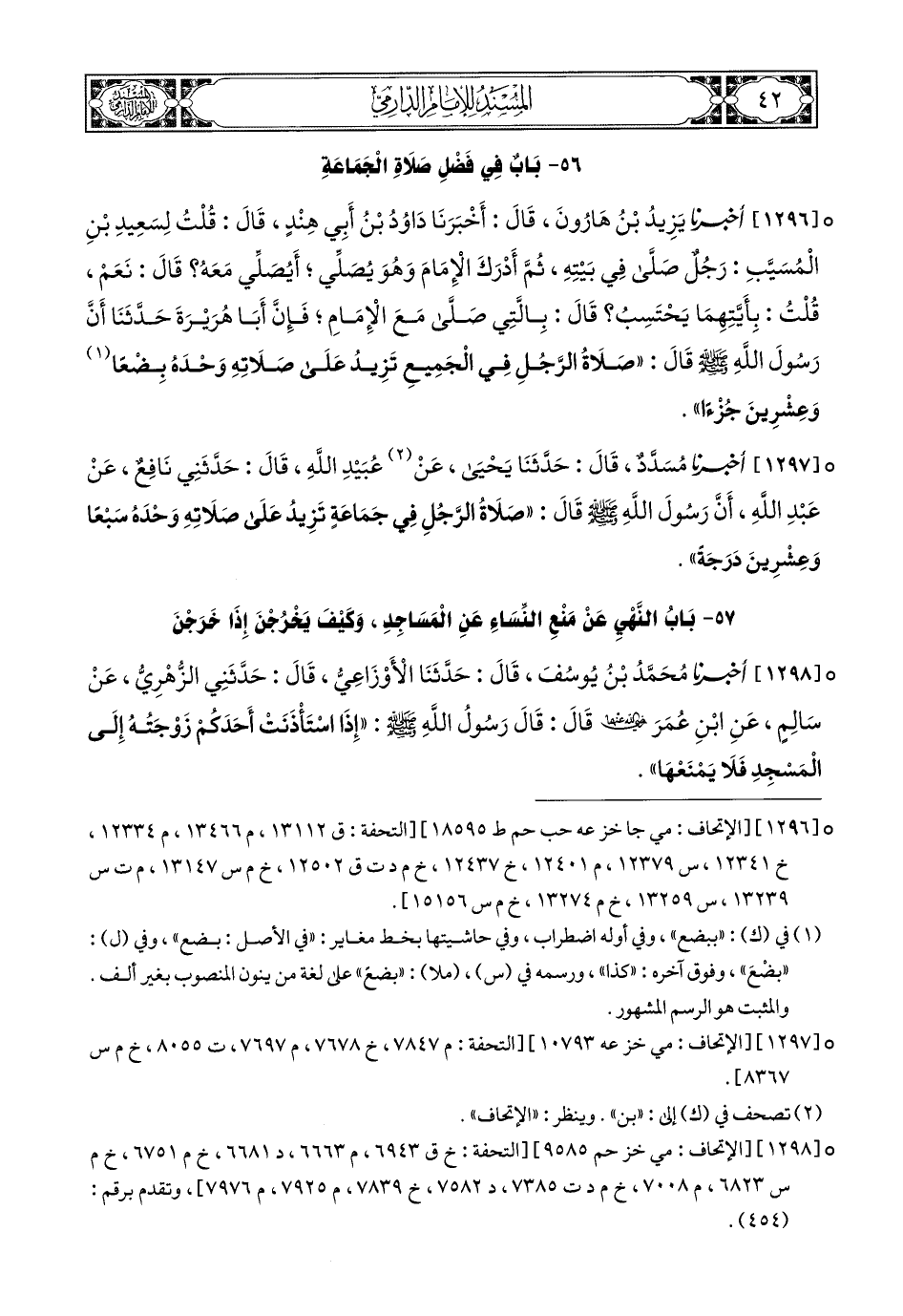 1296- أَخبَرَنا يَزِيدُ بْنُ هَارُونَ, قَالَ: أَخبَرَنا دَاوُدُ بْنُ أَبِي هِنْدٍ, قَالَ: قُلْتُ لِسَعِيدِ بْنِ الْمُسَيَّبِ: رَجُلٌ صَلَّى فِي بَيْتِهِ, ثُمَّ أَدْرَكَ الإِمَامَ وَهُوَ يُصَلِّي, أَيُصَلِّي مَعَهُ؟ قَالَ: نَعَمْ, قُلْتُ: بِأَيَّتِهِمَا يَحْتَسِبُ؟ قَالَ: بِالَّتِي صَلَّى مَعَ الإِمَامِ, فَإِنَّ أَبَا هُرَيْرَةَ حَدَّثَنَا, أَنَّ رَسُولَ اللهِ صَلى الله عَليهِ وسَلم, قَالَ: صَلاَةُ الرَّجُلِ فِي الْجَمِيعِ تَزِيدُ عَلَى صَلاَتِهِ وَحْدَهُ بِضْعًا (1) وَعِشْرِينَ جُزْءًا.