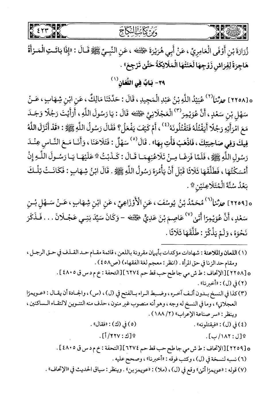 2258- حَدَّثَنَا عُبَيْدُ اللهِ بْنُ عَبْدِ الْمَجِيدِ, قَالَ: حَدَّثَنَا مَالِكٌ, عَنِ ابْنِ شِهَابٍ, عَنْ سَهْلِ بْنِ سَعْدٍ, أَنَّ عُوَيْمِرًا الْعَجْلاَنِيَّ رَضِيَ اللهُ عَنْهُ قَالَ: يَا رَسُولَ اللهِ, أَرَأَيْتَ رَجُلاً وَجَدَ مَعَ امْرَأَتِهِ رَجُلًا, أَيَقْتُلُهُ فَتَقْتُلُونَهُ, أَمْ كَيْفَ يَفْعَلُ؟ فَقَالَ رَسُولُ اللهِ صَلى الله عَليهِ وسَلم: قَدْ أَنْزَلَ اللهُ فِيكَ وَفِي صَاحِبَتِكَ, فَاذْهَبْ فَأْتِ بِهَا, قَالَ سَهْلٌ: فَتَلاَعَنَا, وَأَنَا مَعَ النَّاسِ عِنْدَ رَسُولِ اللهِ صَلى الله عَليهِ وسَلم, فَلَمَّا فَرَغَا مِنْ تَلاَعُنِهِمَا, قَالَ: كَذَبْتُ عَلَيْهَا يَا رَسُولَ اللهِ, إِنْ أَمْسَكْتُهَا فَطَلَّقَهَا ثَلاَثًا قَبْلَ أَنْ يَأْمُرَهُ رَسُولُ اللهِ صَلى الله عَليهِ وسَلم.