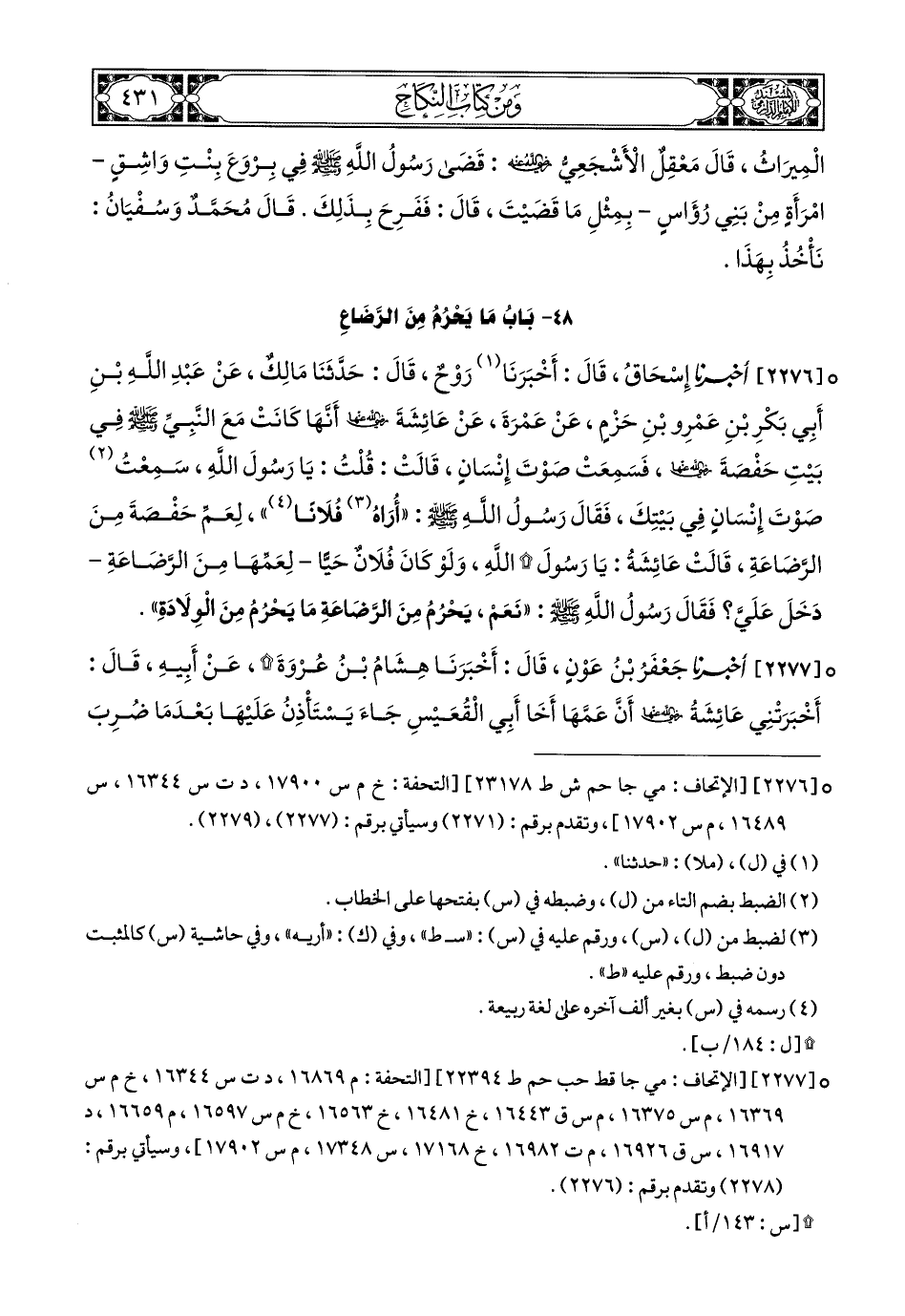 2277- أَخبَرَنا جَعْفَرُ بْنُ عَوْنٍ, قَالَ: أَخبَرَنا هِشَامُ بْنُ عُرْوَةَ, عَنْ أَبِيهِ, قَالَ: أَخْبَرَتْنِي عَائِشَةُ رَضِيَ اللهُ عَنْهَا, أَنَّ عَمَّهَا أَخَا أَبِي الْقُعَيْسِ جَاءَ يَسْتَأْذِنُ عَلَيْهَا بَعْدَ مَا ضُرِبَ الْحِجَابُ, فَأَبَتْ أَنْ تَأْذَنَ لَهُ, حَتَّى يَأْتِيَ رَسُولُ اللهِ صَلى الله عَليهِ وسَلم, فَأَسْتَأْذِنَهُ (1), فَلَمَّا جَاءَ النَّبِيُّ صَلى الله عَليهِ وسَلم ذَكَرَتْ ذَلِكَ لَهُ, فَقَالَتْ: جَاءَ عَمِّي أَخُو أَبِي الْقُعَيْسِ, فَرَدَدْتُهُ, حَتَّى أَسْتَأْذِنَكَ, قَالَ: أَوَلَيْسَ بِعَمِّكِ؟ قَالَتْ: إِنَّمَا أَرْضَعَتْنِي الْمَرْأَةُ, وَلَمْ يُرْضِعْنِي الرَّجُلُ, فَقَالَ: إِنَّهُ عَمُّكِ, فَلْيَلِجْ عَلَيْكِ.