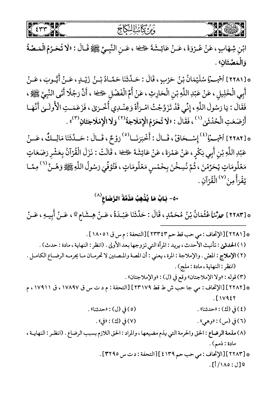 2281- أَخبَرَنا سُلَيْمَانُ بْنُ حَرْبٍ, قَالَ: حَدَّثَنَا حَمَّادُ بْنُ زَيْدٍ, عَنْ أَيُّوبَ, عَنْ أَبِي الْخَلِيلِ, عَنْ عَبْدِ اللهِ بْنِ الْحَارِثِ, عَنْ أُمِّ الْفَضْلِ رَضِيَ اللهُ عَنْهَا, أَنَّ رَجُلاً أَتَى النَّبِيَّ صَلى الله عَليهِ وسَلم, فَقَالَ: يَا رَسُولَ اللهِ, إِنِّي قَدْ تَزَوَّجْتُ امْرَأَةً, وَعِنْدِي أُخْرَى, فَزَعَمَتِ الأُولَى أَنَّهَا أَرْضَعَتِ الْحُدْثَى, فَقَالَ: لاَ تُحَرِّمُ الإِمْلاَجَةُ, وَلاَ الإِمْلاَجَتَانِ.