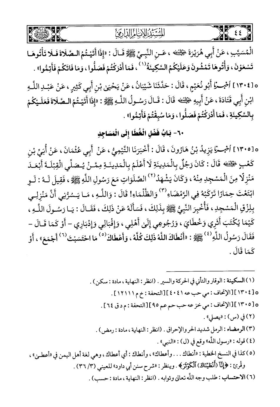 1305- أَخبَرَنا يَزِيدُ بْنُ هَارُونَ, قَالَ: أَخبَرَنا التَّيْمِيُّ (1), عَنْ أَبِي عُثْمَانَ, عَنْ أُبَيِّ بْنِ كَعْبٍ رَضِيَ اللهُ عَنْهُ, قَالَ: كَانَ رَجُلٌ بِالْمَدِينَةِ لاَ أَعْلَمُ بِالْمَدِينَةِ مِمَّنْ يُصَلِّي الْقِبْلَةَ أَبْعَدَ مَنْزِلاً مِنَ الْمَسْجِدِ مِنْهُ, وَكَانَ يَشْهَدُ الصَّلَوَاتِ مَعَ رَسُولِ اللهِ صَلى الله عَليهِ وسَلم, فَقِيلَ لَهُ: لَوِ ابْتَعْتَ حِمَارًا تَرْكَبُهُ فِي الرَّمْضَاءِ وَالظَّلْمَاءِ, قَالَ: وَاللهِ مَا يَسُرُّنِي أَنَّ مَنْزِلِي بِلِزْقِ الْمَسْجِدِ, فَأُخْبِرَ النَّبِيُّ صَلى الله عَليهِ وسَلم بِذَلِكَ, فَسَأَلَهُ عَنْ ذَلِكَ, فَقَالَ: يَا رَسُولَ اللهِ, كَيْمَا يُكْتَبَ أَثَرِي وَخُطَايَ, وَرُجُوعِي إِلَى أَهْلِي, وَإِقْبَالِي وَإِدْبَارِي, أَوْ كَمَا قَالَ, فَقَالَ رَسُولُ اللهِ صَلى الله عَليهِ وسَلم: أَنْطَاكَ اللهُ ذَلِكَ كُلَّهُ, وَأَعْطَاكَ مَا احْتَسَبْتَ أَجْمَعَ, أَوْ كَمَا قَالَ.